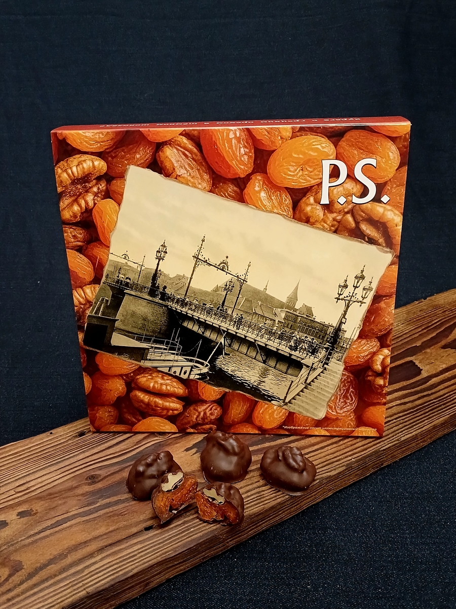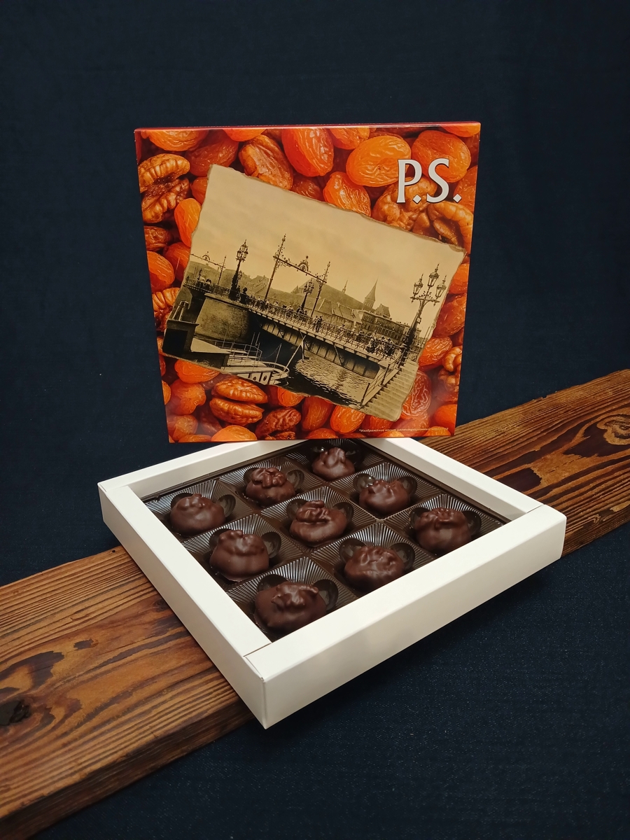 Цельная курага с грецким орехом в натуральном темном шоколаде. Подарочная коробка с видами старого Кёнигсберга.