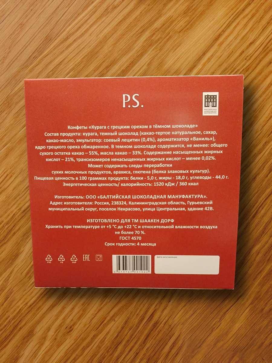 Состав продукта: курага, темный шоколад (какао-тертое натуральное, сахар, какао-масло, эмульгатор: соевый лецитин (0,4%), ароматизатор «Ваниль»), ядро грецкого ореха обжаренное. В темном шоколаде содержится, не менее: общего сухого остатка какао – 55%, масла какао – 33%. Содержание насыщенных жирных кислот – 21%, трансизомеров ненасыщенных жирных кислот – менее 0,02%.