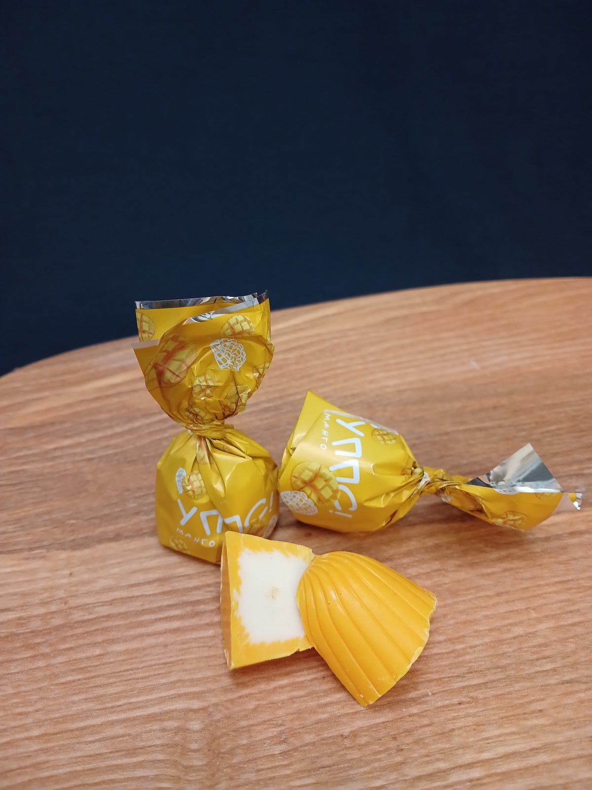 Конфеты с натуральным манго в йогуртовой начинке. Состав: глазурь (сахар, заменитель какао-масла (пальмоядровый стеарин, эмульгаторы: Е492, Е322), сыворотка сухая молочная, творог сухой (молоко сухое обезжиренное, молоко сухое цельное, заквасочная культура на основе Streptococcus salivarius ssp. thermophilus, Lactococcus lactis subsp. cremoris, Lactococcus lactis subsp. lactis, Lactococcus lactis subsp. lactis biovar diacetylactis), эмульгатор Е322 (соевый лецитин), краситель натуральный – кармин, ароматизатор «Йогурт»; начинка (сахар, заменитель молочного жира (растительные масла: пальмовое, подсолнечное, пальмоядровое), сыворотка сухая молочная, творог сухой (молоко сухое обезжиренное, молоко сухое цельное, заквасочная культура на основе Streptococcus salivarius ssp. thermophilus, Lactococcus lactis subsp. cremoris, Lactococcus lactis subsp. lactis, Lactococcus lactis subsp. lactis biovar diacetylactis), манго сублимированный, эмульгатор Е322 (соевый лецитин), ароматизатор «Манго». Может содержать следы переработки арахиса, орехов, глютена (белка злаковых культур).