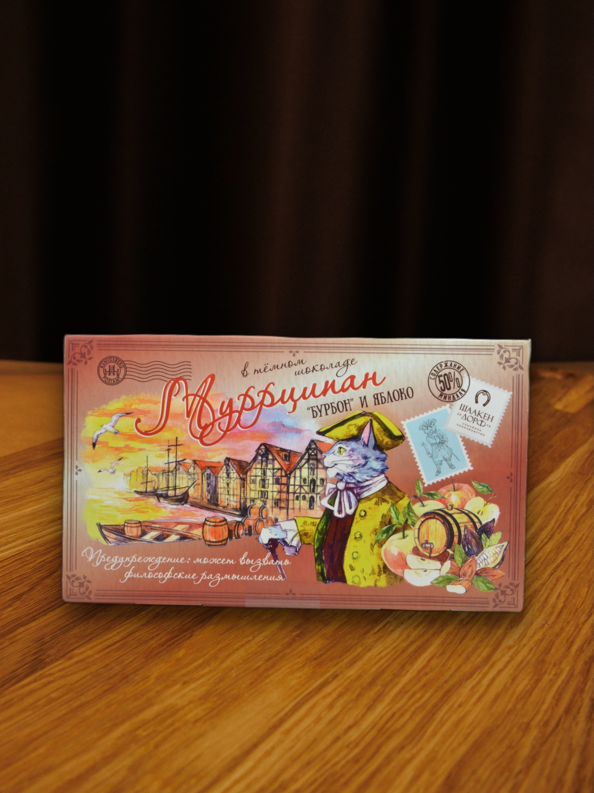 Состав продукта: марципан (миндаль (50 %), сахар, сироп глюкозно-фруктозный, агент влагоудерживающий – сорбит, ферментный препарат микробного происхождения – инвертаза, регулятор кислотности – лимонная кислота); темный шоколад (какао тертое натуральное, сахар, какао-масло, эмульгатор – соевый лецитин, ароматизатор «Ваниль»); яблоко сублимационной сушки, ароматизатор. Темный шоколад содержит: общий сухой остаток какао – не менее 50 %, масло какао - не менее 33 %.