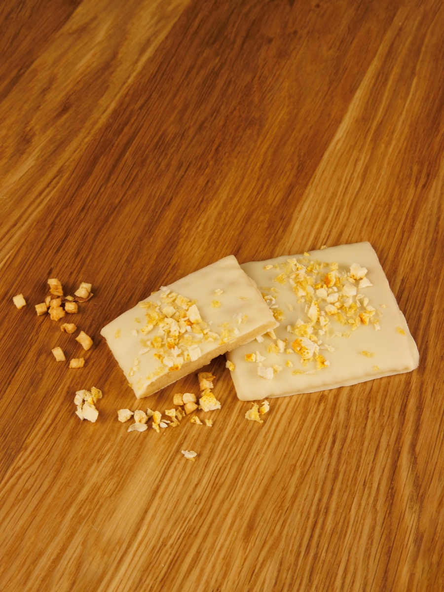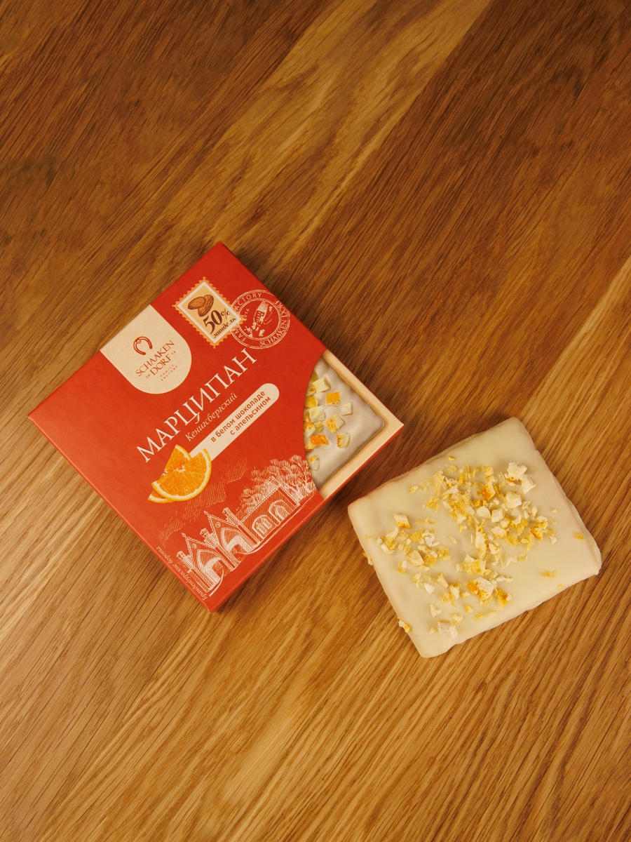 Марципановая плитка (50% миндаля) в натуральном белом шоколаде с обсыпкой из сушеных апельсинов.