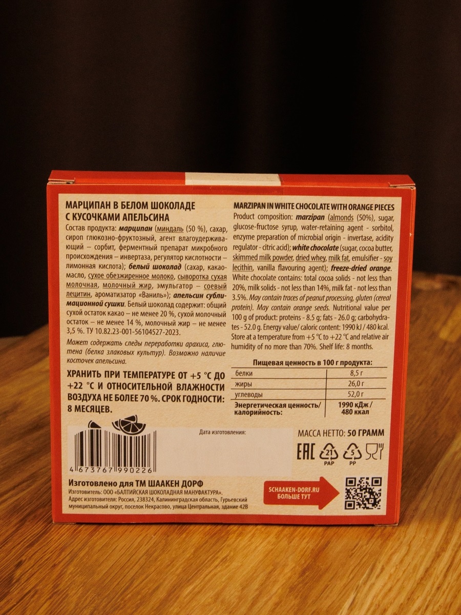 Состав: марципан (сахар, миндаль (50 %), сироп глюкозно-фруктозный, сорбит, инвертаза, регулятор кислотности – лимонная кислота); белый шоколад (сахар, какао-масло, сухое обезжиренное молоко, сыворотка сухая молочная, молочный жир, эмульгатор – соевый лецитин, ароматизатор «Ваниль»; апельсин сублимационной сушки. Может содержать следы переработки арахиса, глютена (белка злаковых культур). Возможно наличие косточек апельсина.