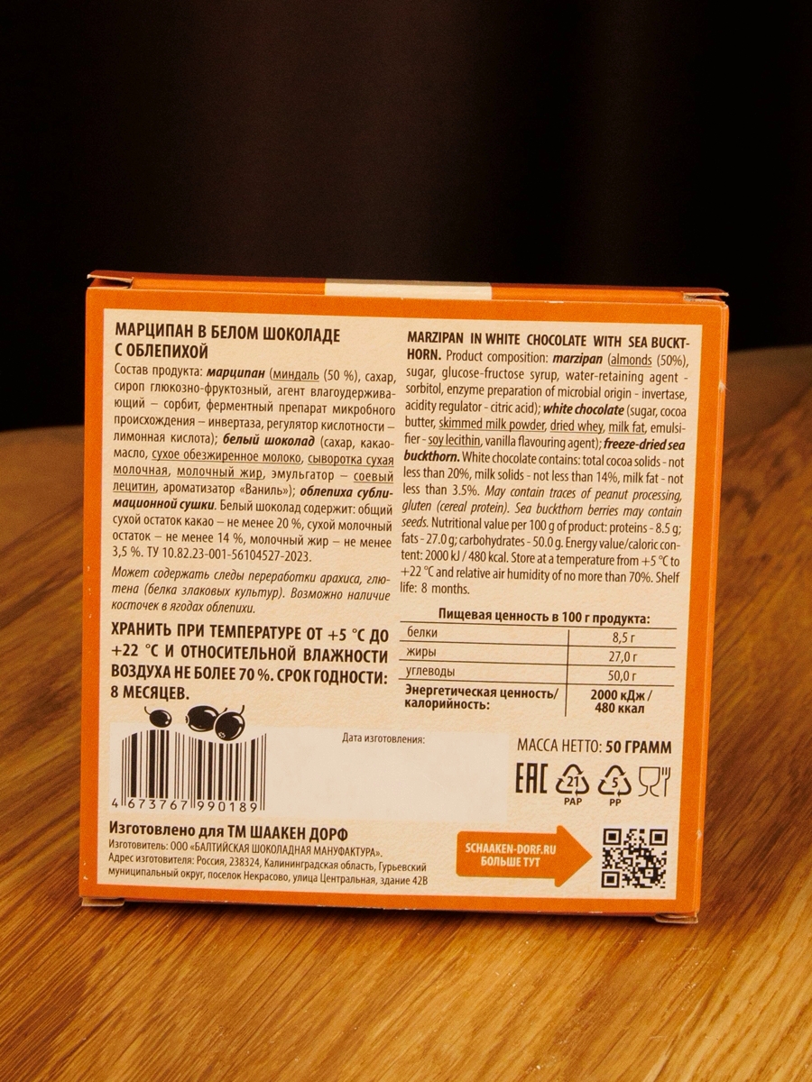 Состав: марципан (сахар, миндаль (50 %), сироп глюкозно-фруктозный, сорбит, инвертаза, регулятор кислотности – лимонная кислота); белый шоколад (сахар, какао-масло, сухое обезжиренное молоко, сыворотка сухая молочная, молочный жир, эмульгатор – соевый лецитин, ароматизатор «Ваниль»; облепиха сублимационной сушки. Может содержать следы переработки арахиса, глютена (белка злаковых культур). Возможно наличие косточек в ягодах облепихи.