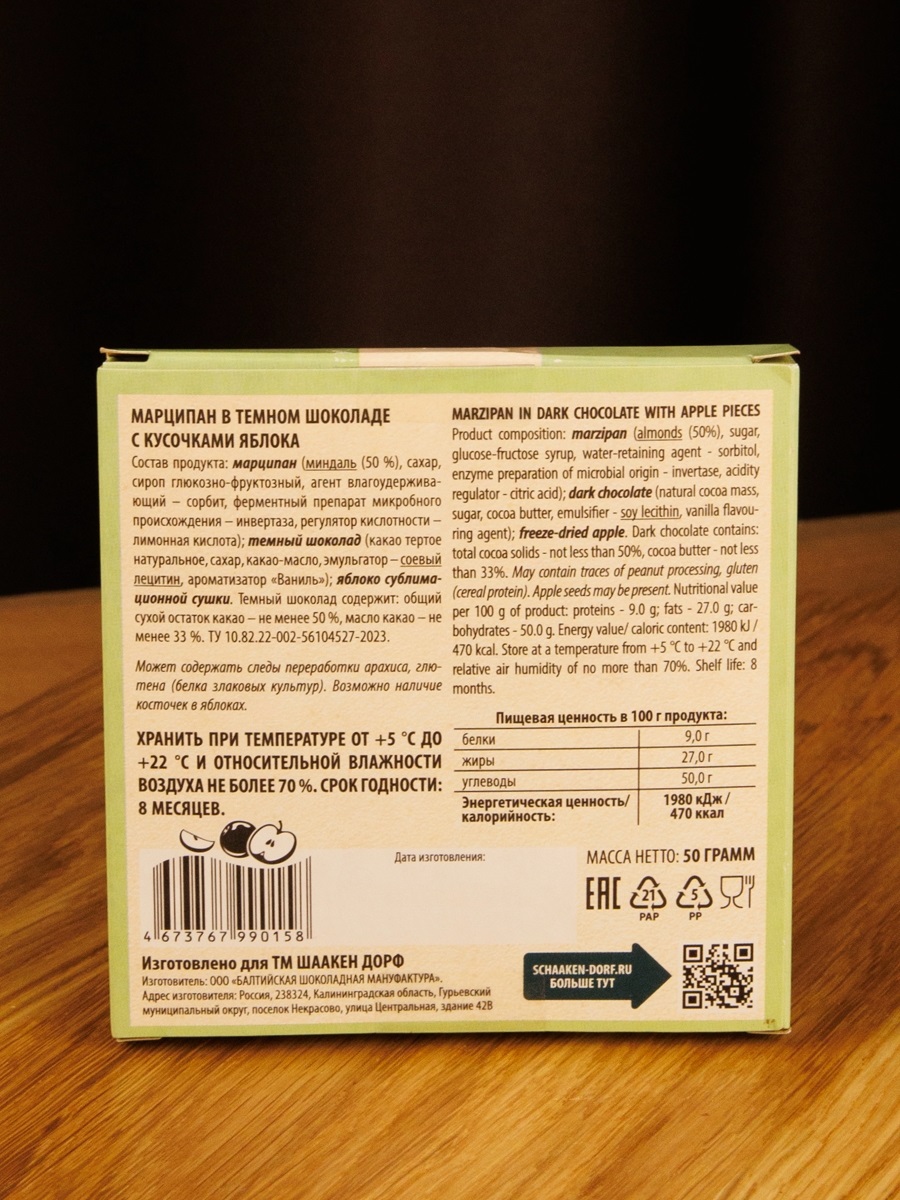 Состав: марципан (сахар, миндаль (50%), сироп глюкозно-фруктозный, сорбит, инвертаза, регулятор кислотности – лимонная кислота); темный шоколад (какао тертое натуральное, сахар, какао-масло, эмульгатор – соевый лецитин, ароматизатор «Ваниль»; яблоко сублимационной сушки. Может содержать следы переработки молочных продуктов, арахиса, глютена (белка злаковых культур). Возможно наличие косточек в яблоках.