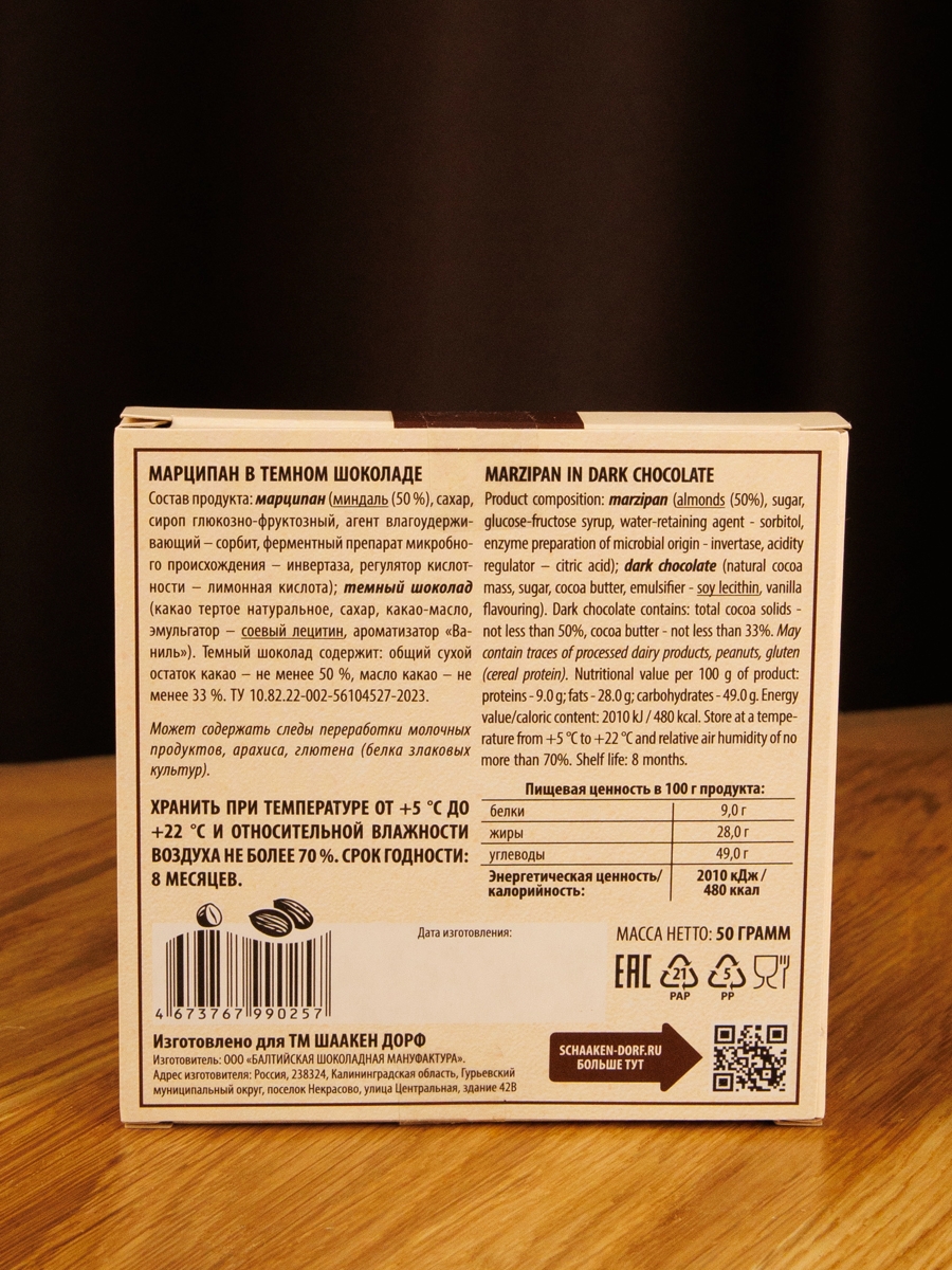Состав: марципан (сахар, миндаль (50 %), сироп глюкозно-фруктозный, сорбит, инвертаза, регулятор кислотности – лимонная кислота); темный шоколад (какао тертое натуральное, сахар, какао-масло, эмульгатор – соевый лецитин, ароматизатор «Ваниль». Может содержать следы переработки молочных продуктов, арахиса, глютена (белка злаковых культур).