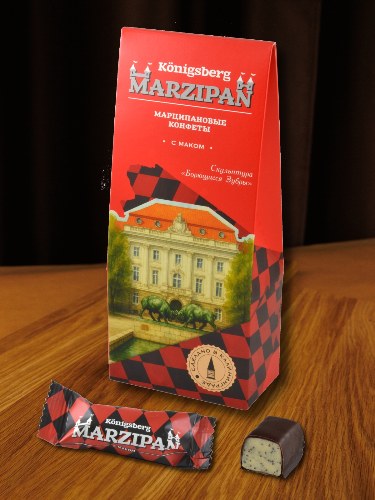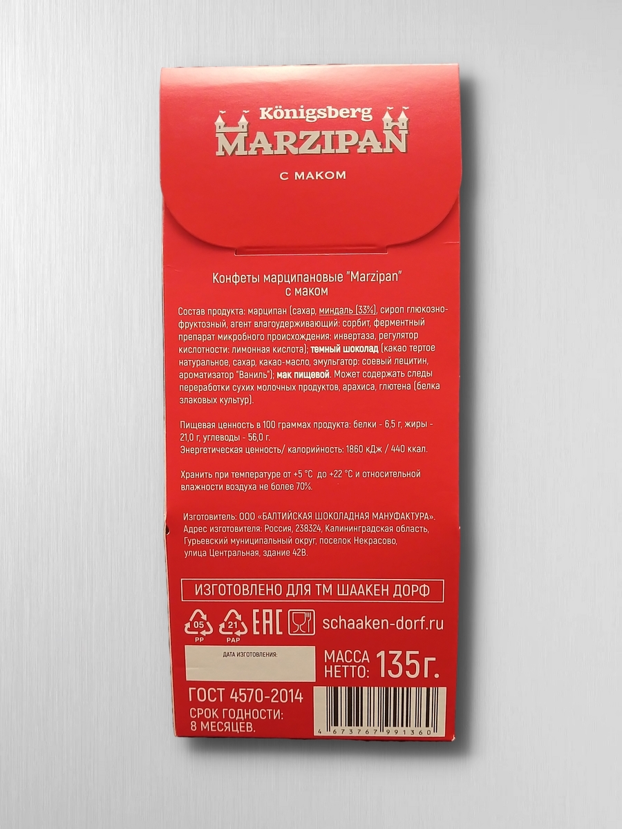 Состав: марципан (сахар, миндаль (33%), сироп глюкозно-фруктозный, агент влагоудерживающий: сорбит, ферментный препарат микробного происхождения: инвертаза, регулятор кислотности: лимонная кислота); темный шоколад (какао тертое натуральное, сахар, какао-масло, эмульгатор: соевый лецитин, ароматизатор "Ваниль"); мак пищевой.