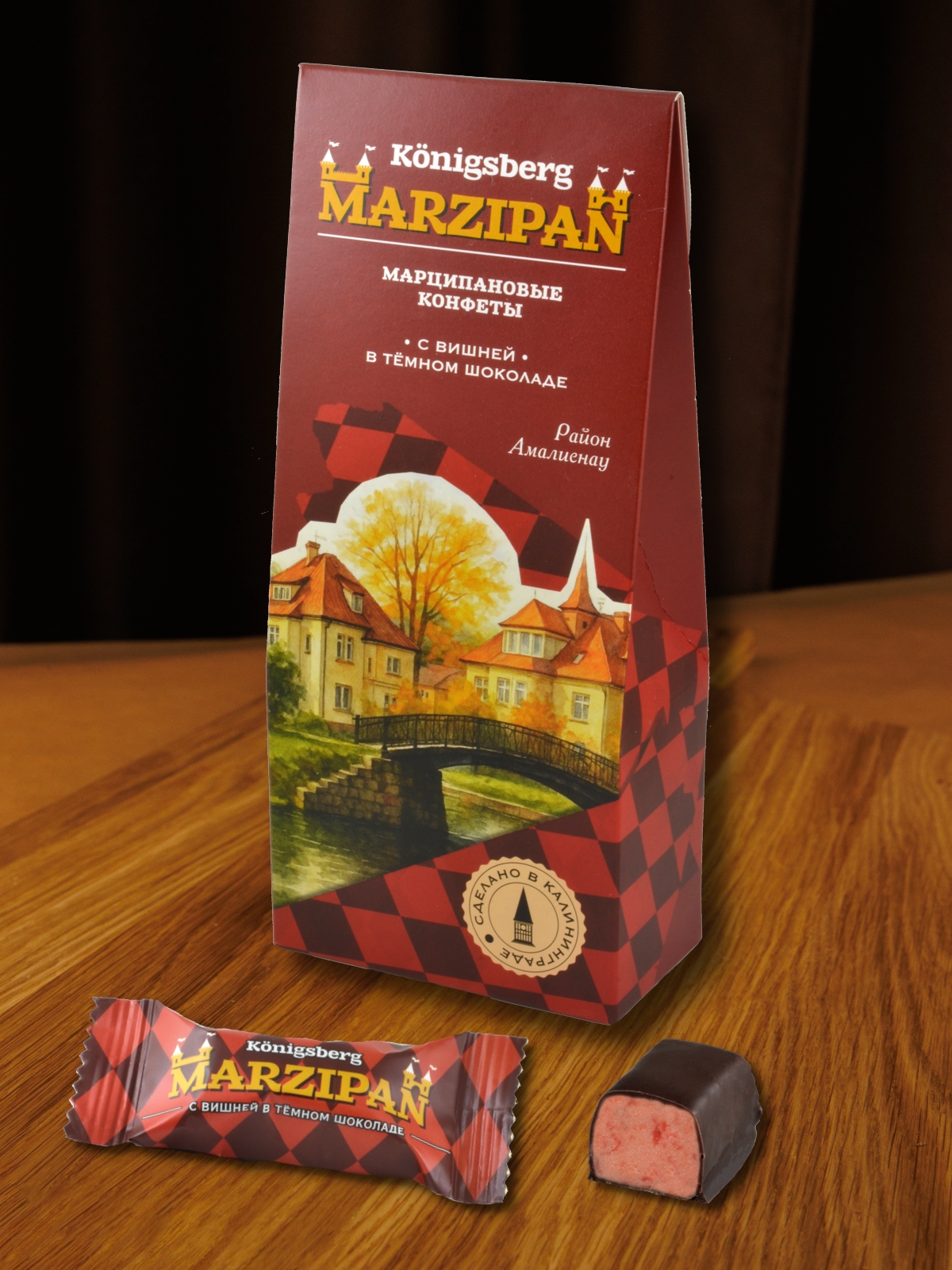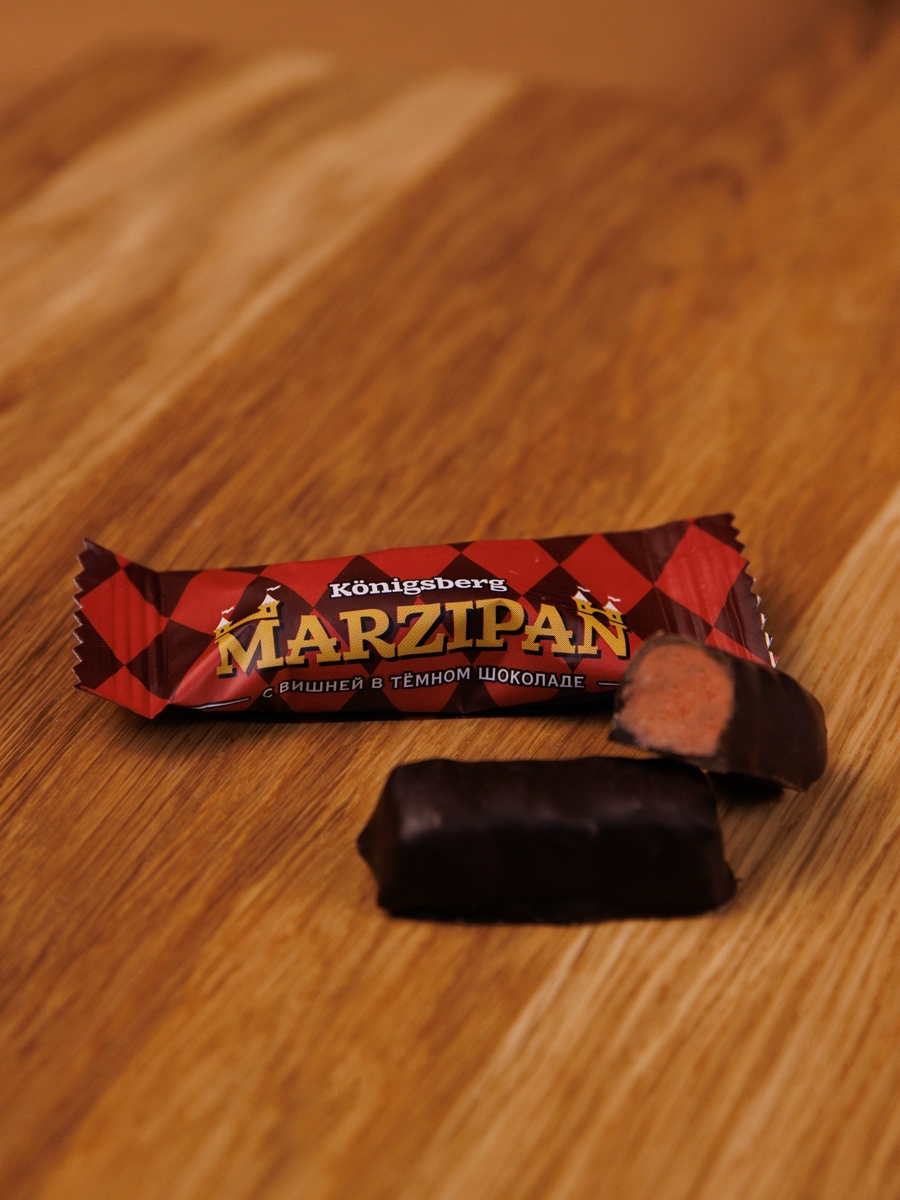 Состав: марципан (сахар, миндаль (33%), сироп глюкозно-фруктозный, агент влагоудерживающий: сорбит, ферментный препарат микробного происхождения: инвертаза, регулятор кислотности: лимонная кислота); темный шоколад (какао тертое натуральное, сахар, какао-масло, эмульгатор: соевый лецитин, ароматизатор "Ваниль"); цукаты из вишни (вишня, сахар).