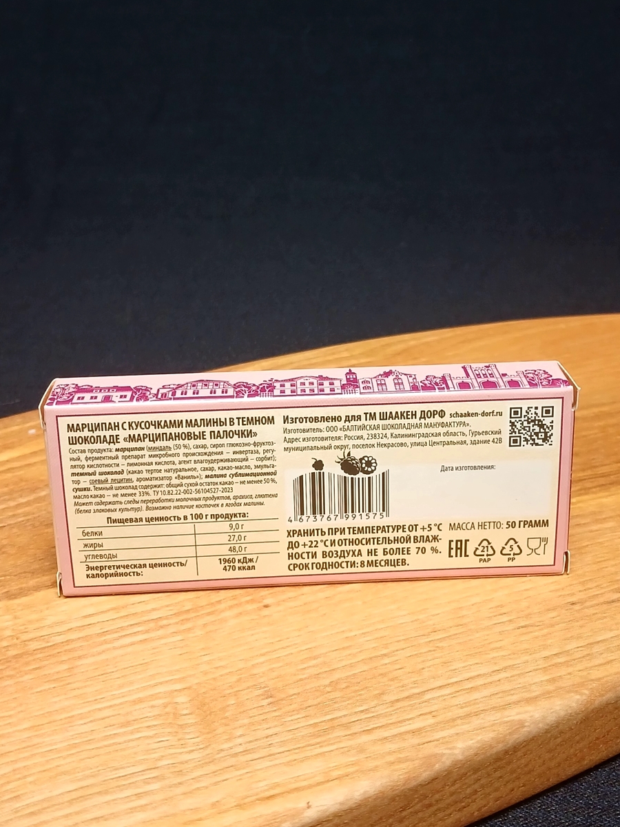 - Марципановые палочки с кусочками малины в темном шоколаде, 50 гр