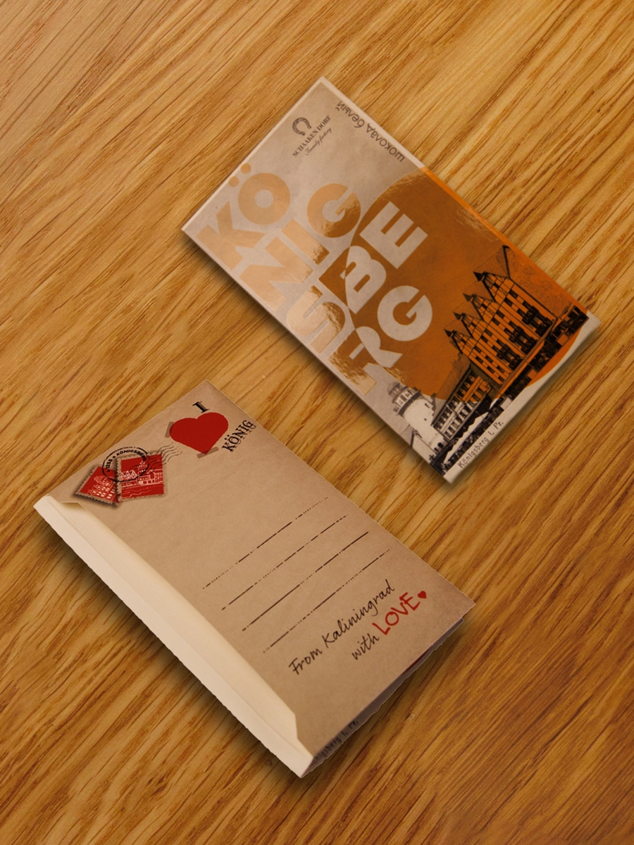 Белый шоколад (30% какао-масла). Упаковка в виде открытки с изображением достопримечательностей Кёнигсберга.