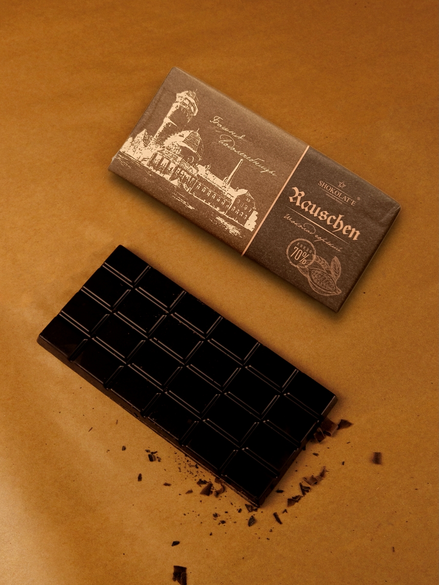 Горький шоколад (70% какао). Упаковка с изображением водонапорной башни в г. Светлогорск (нем. Rauschen).