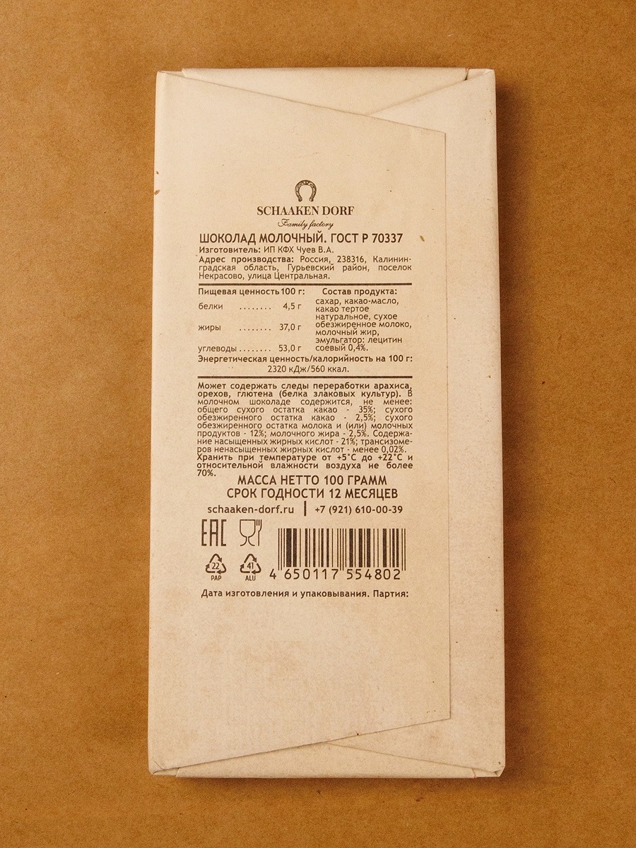 Молочный шоколад (35% какао). Обертка с изображением Рыбной деревни в Калининграде.