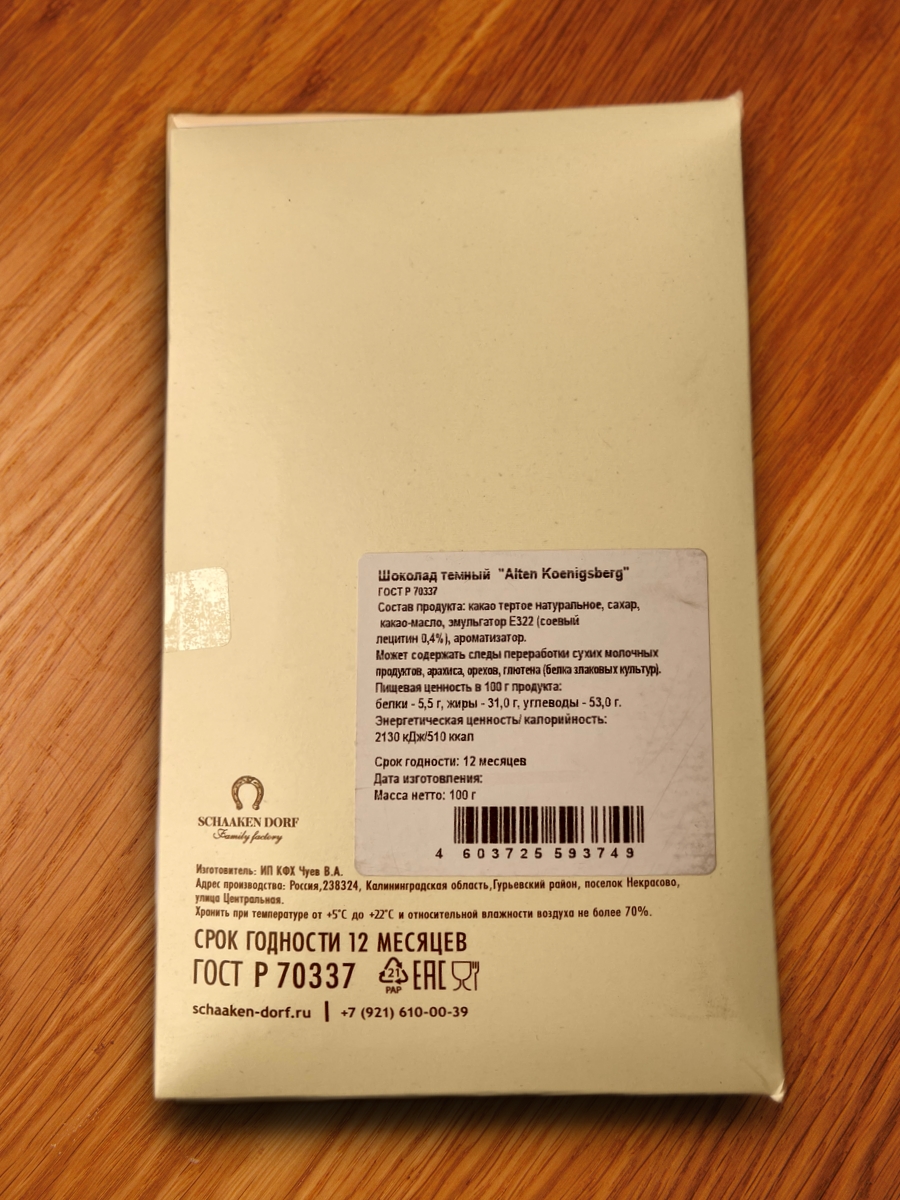 Темный шоколад (55% какао). Упаковка в виде открытки с изображением Кёнигсбергского Замка.