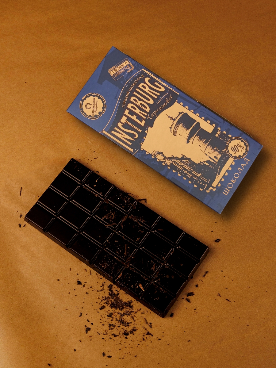 Горький шоколад (90% какао). Обертка с изображением Водонапорной башни в г. Черняховск (нем. Insterburg).