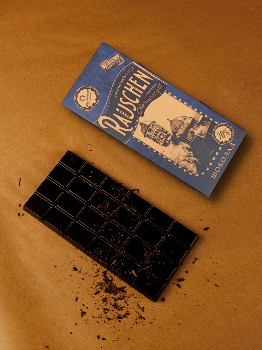 Горький шоколад (70% какао). Обертка с изображением Водонапорной башни в г. Светлогорск (нем. Rauschen).