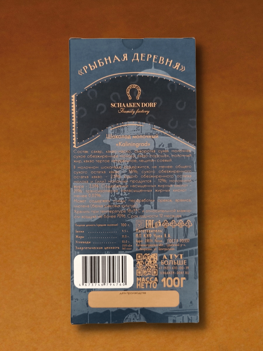 Молочный шоколад (35% какао). Обертка с изображением Рыбной деревни в Калининграде.