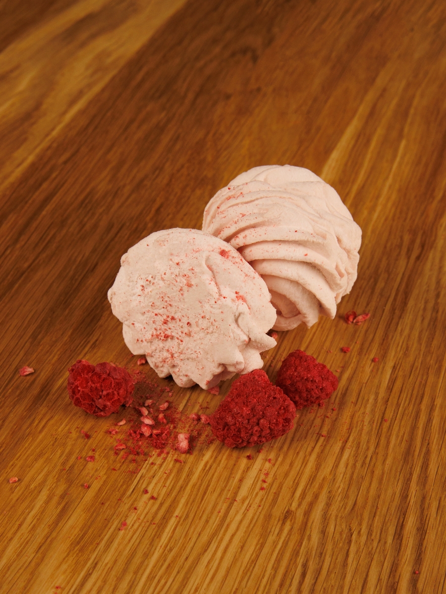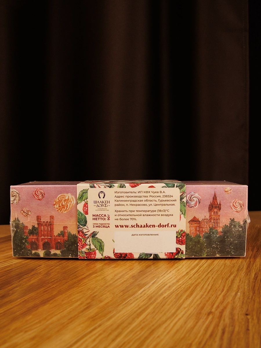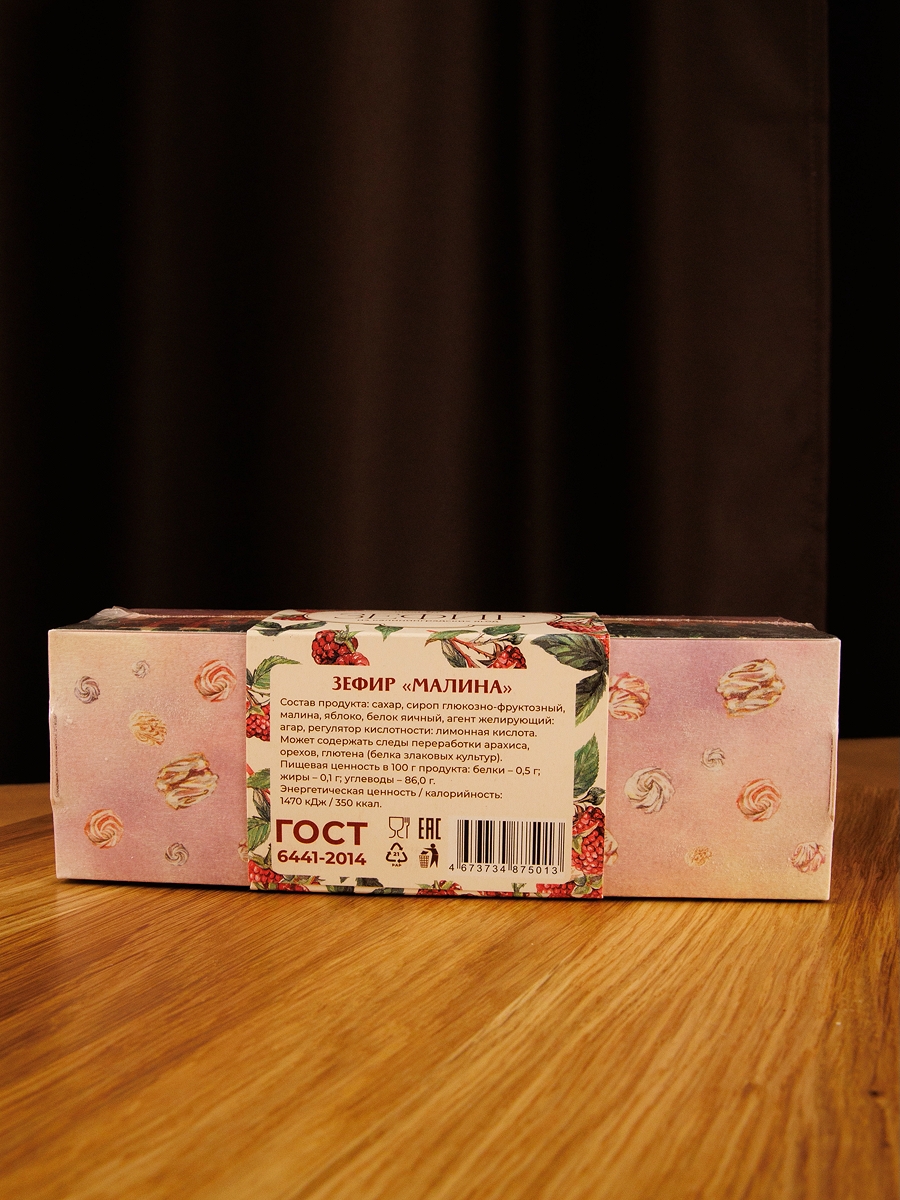 Состав: сахар, сироп глюкозно-фруктозный, малина, яблоко, белок яичный, агент желирующий: агар, регулятор кислотности: лимонная кислота.