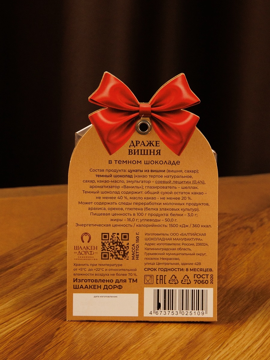 Состав: цукаты из вишни (вишня, сахар); темный шоколад (какао тертое натуральное, сахар, какао-масло, эмульгатор – соевый лецитин (0,4%), ароматизатор «Ваниль»); глазирователь – шеллак. Может содержать следы переработки молочных продуктов, арахиса, глютена (белка злаковых культур).