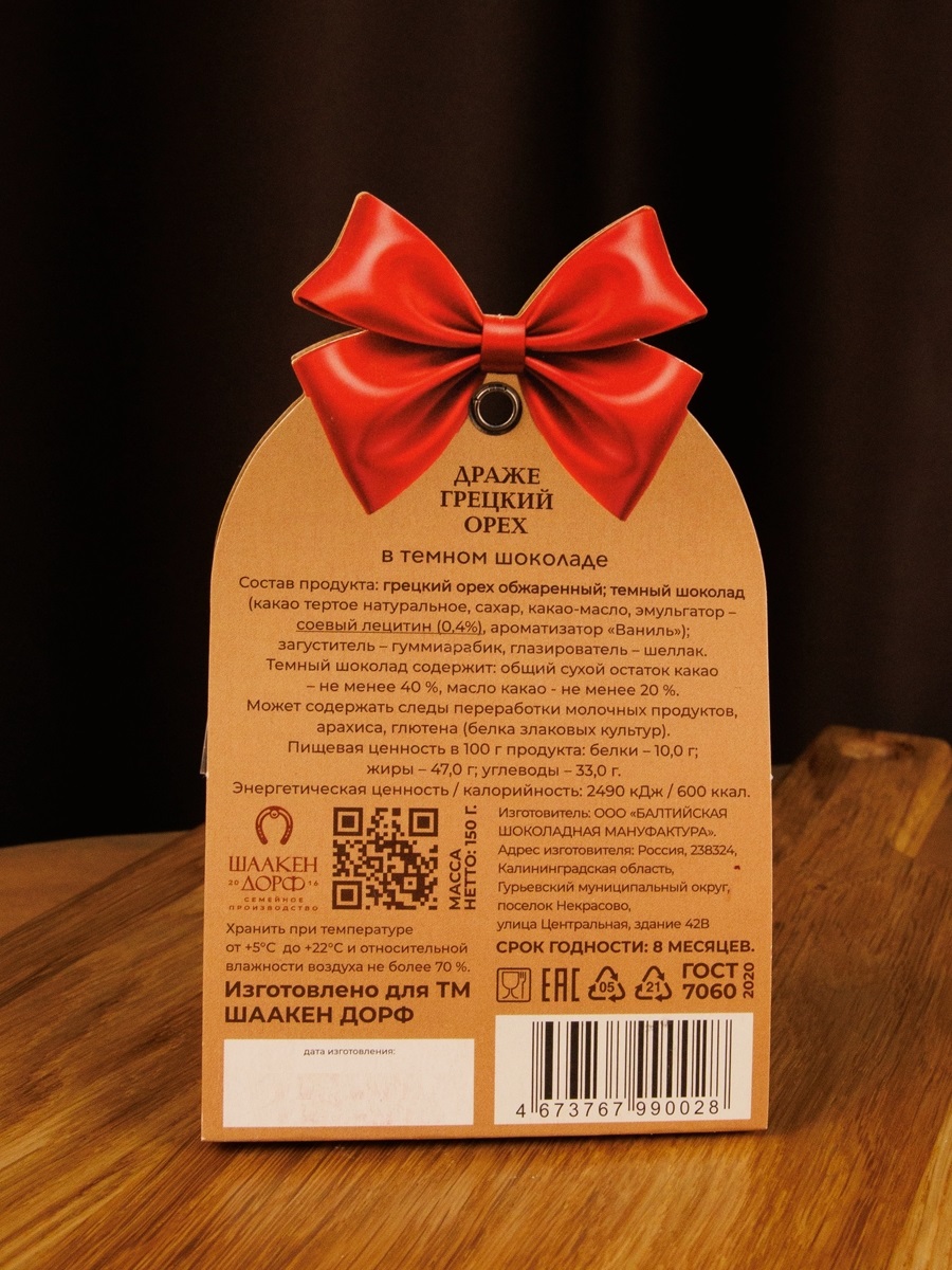 Состав: грецкий орех обжаренный; темный шоколад (какао тертое натуральное, сахар, какао-масло, эмульгатор – соевый лецитин (0,4%), ароматизатор «Ваниль»); загуститель – гуммиарабик, глазирователь – шеллак. Может содержать следы переработки молочных продуктов, арахиса, глютена (белка злаковых культур).