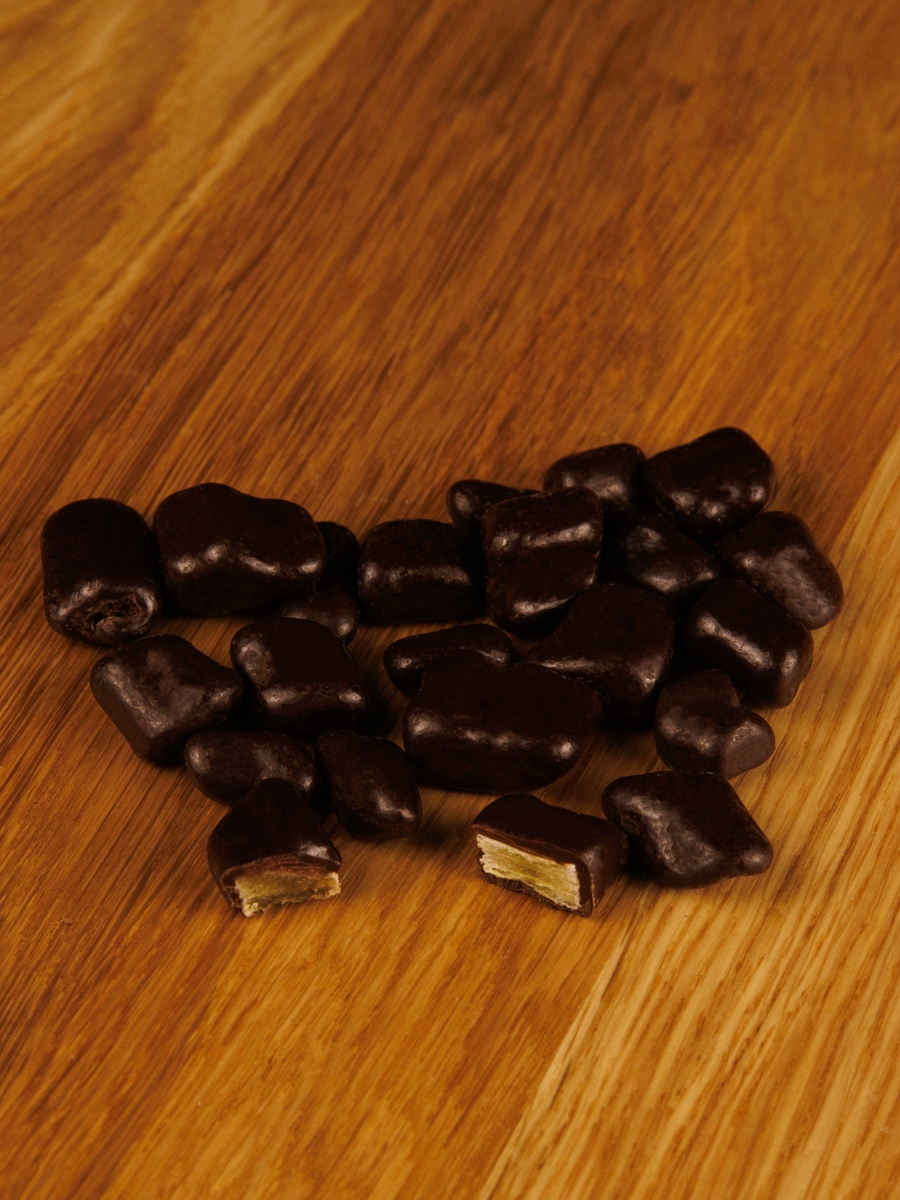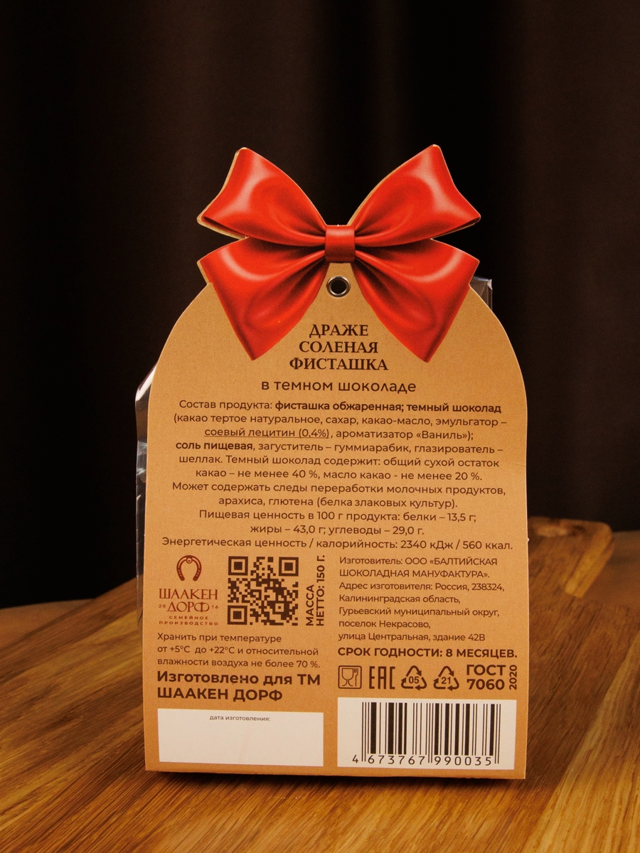 Состав: фисташка обжаренная; темный шоколад (какао тертое натуральное, сахар, какао-масло, эмульгатор – соевый лецитин (0,4%), ароматизатор «Ваниль»); соль пищевая, загуститель – гуммиарабик, глазирователь – шеллак. Может содержать следы переработки молочных продуктов, арахиса, глютена (белка злаковых культур).