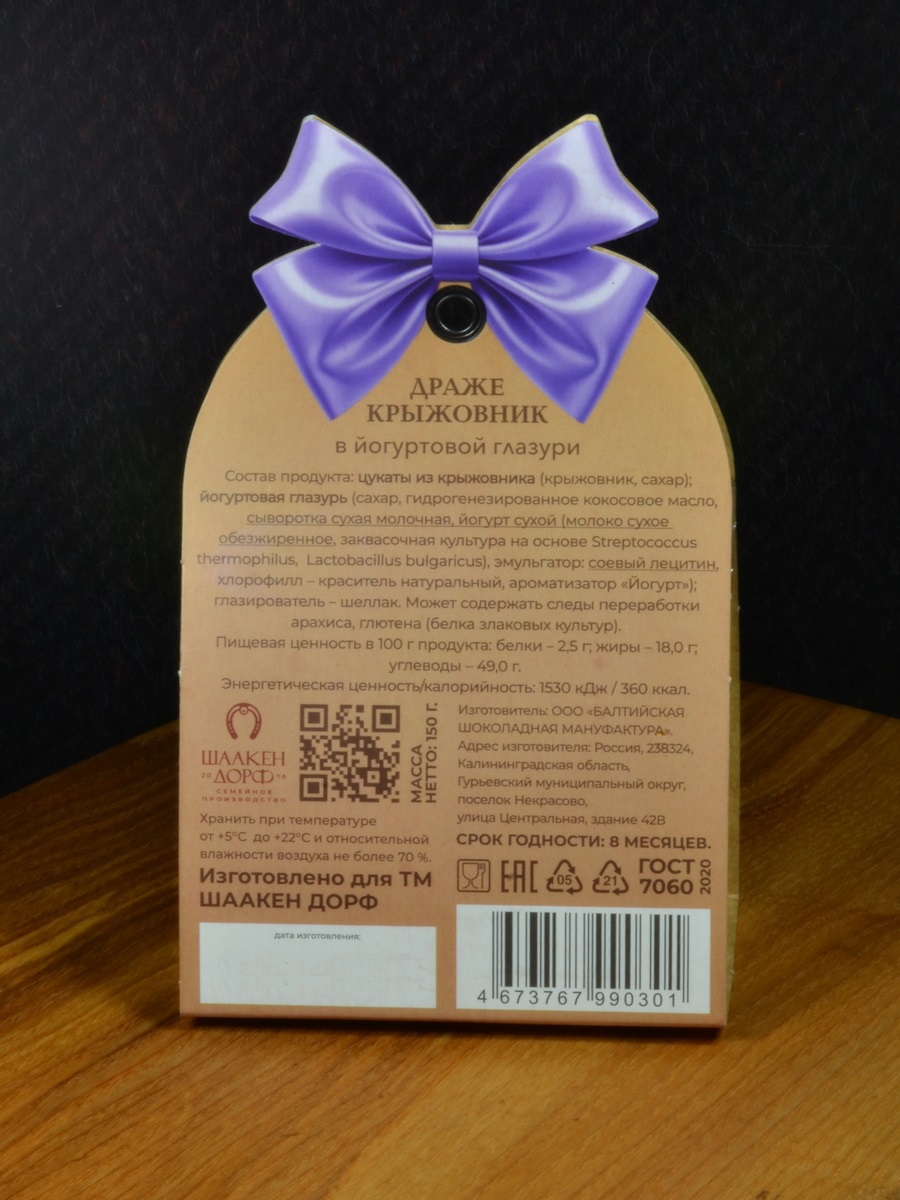 Состав продукта: цукаты из крыжовника (крыжовник, сахар); йогуртовая глазурь (сахар, гидрогенезированное кокосовое масло, сыворотка сухая молочная, йогурт сухой (молоко сухое обезжиренное, заквасочная культура на основе Streptococcus thermophilus, Lactobacillus bulgaricus), эмульгатор: соевый лецитин, хлорофилл – краситель натуральный, ароматизатор «Йогурт»); глазирователь – шеллак.