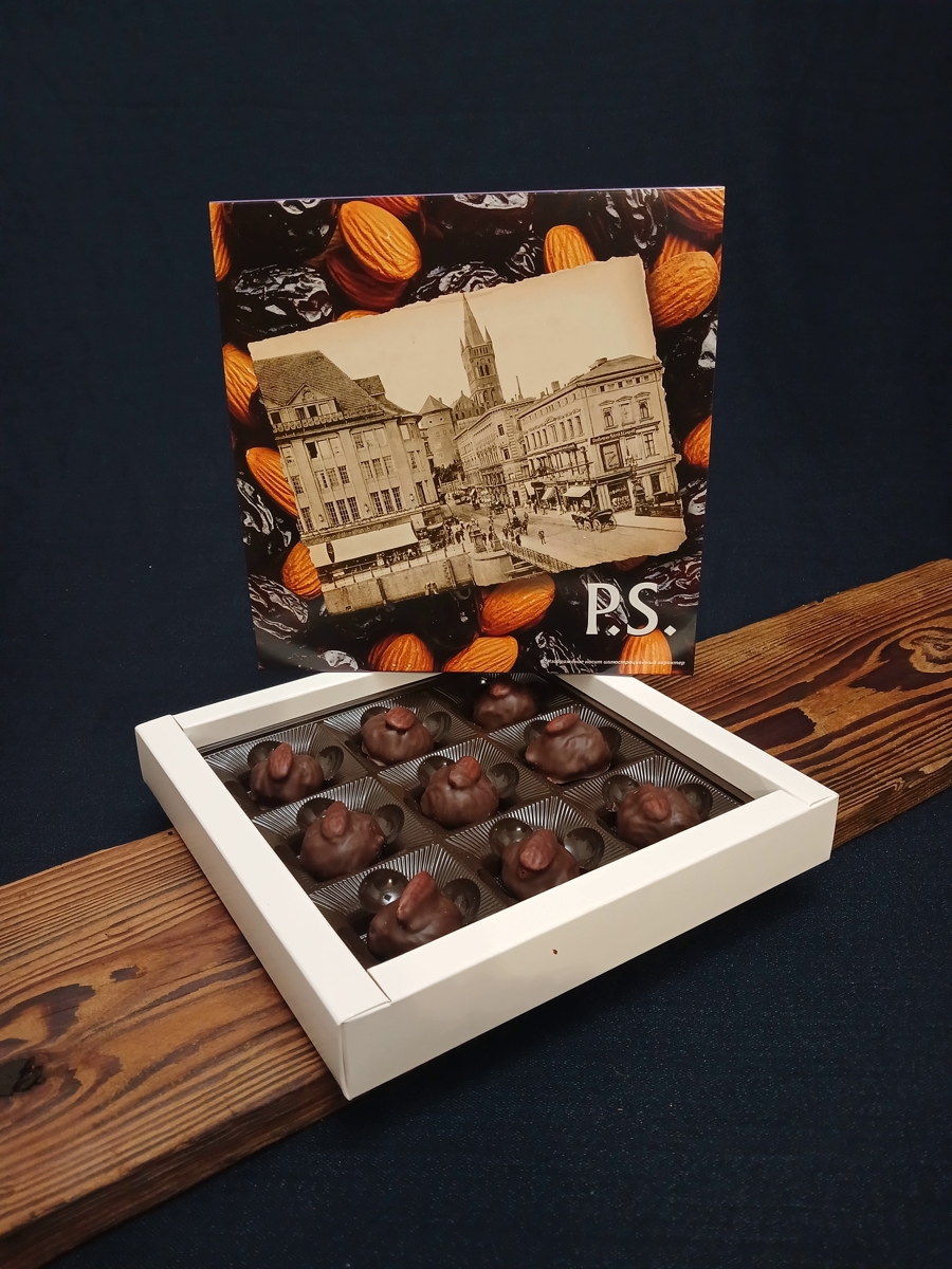 Цельный чернослив с миндалем в натуральном темном шоколаде. Подарочная коробка с видами старого Кёнигсберга.