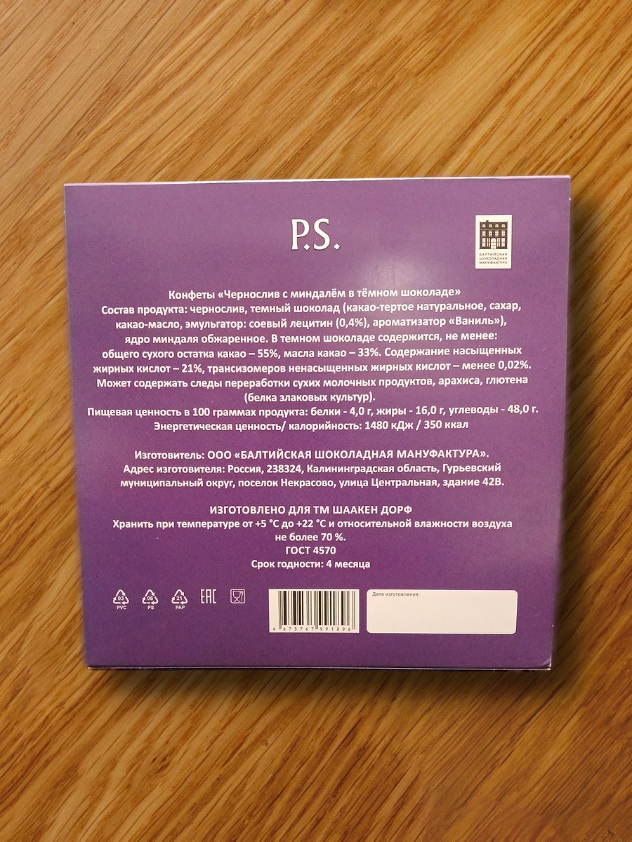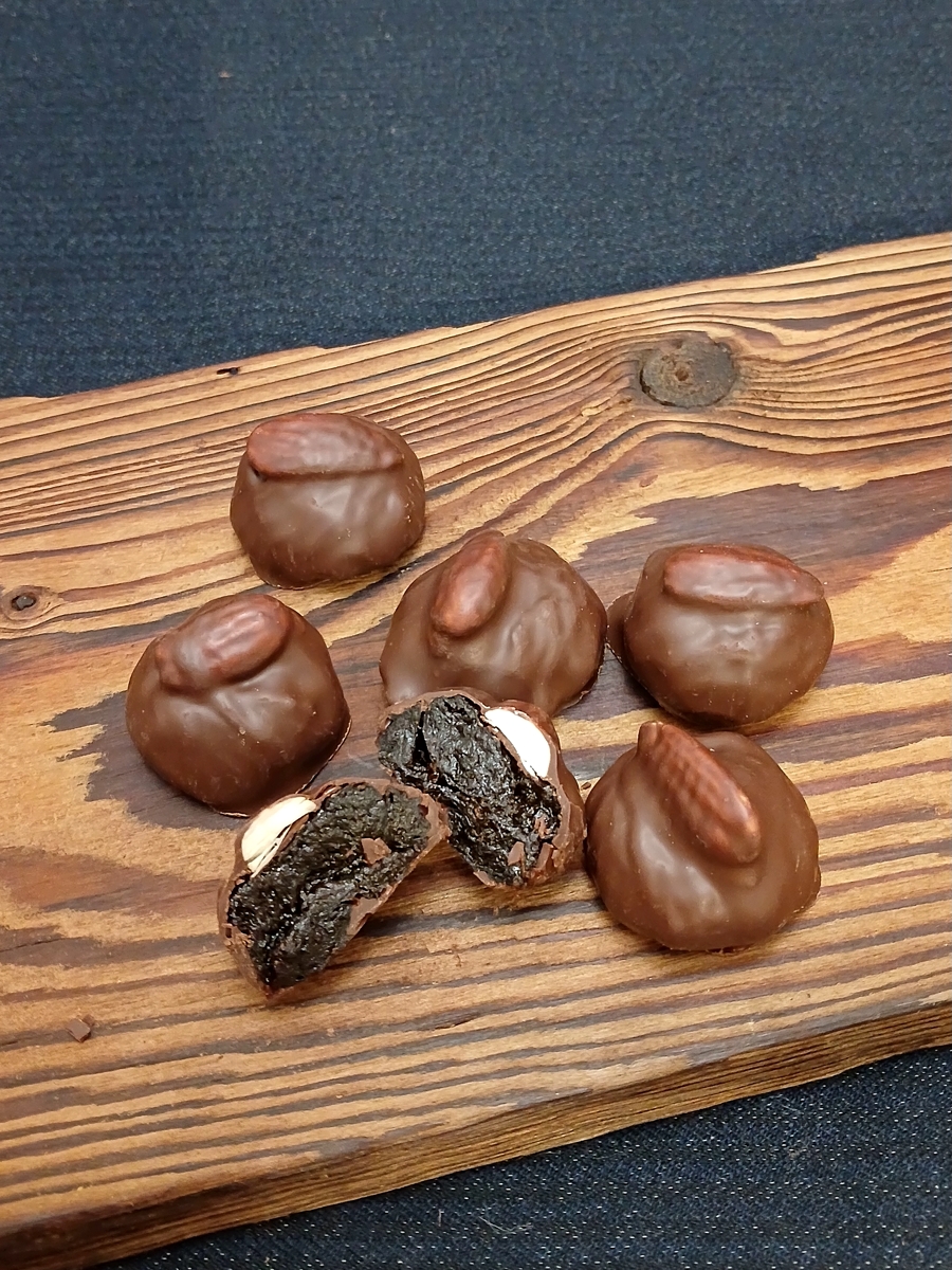 Состав продукта: чернослив, темный шоколад (какао-тертое натуральное, сахар, какао-масло, эмульгатор: соевый лецитин (0,4%), ароматизатор «Ваниль»), ядро миндаля обжаренное. В темном шоколаде содержится, не менее: общего сухого остатка какао – 55%, масла какао – 33%. Содержание насыщенных жирных кислот – 21%, трансизомеров ненасыщенных жирных кислот – менее 0,02%.