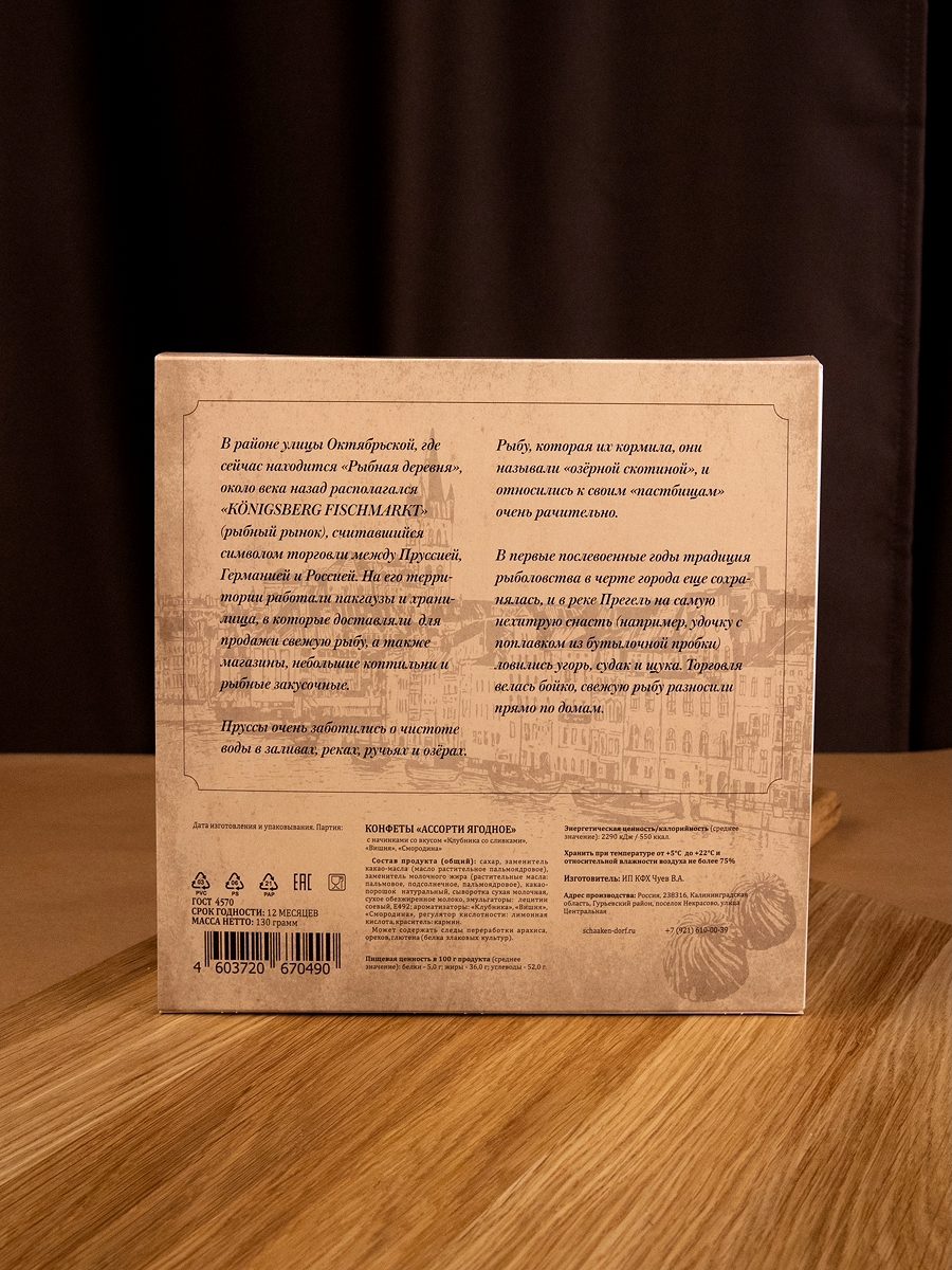 Ассорти из 3 видов шоколадных конфет - пралине со вкусом вишни, клубники и смородины в шоколадной глазури. В подарочной коробке с видами Калининграда.