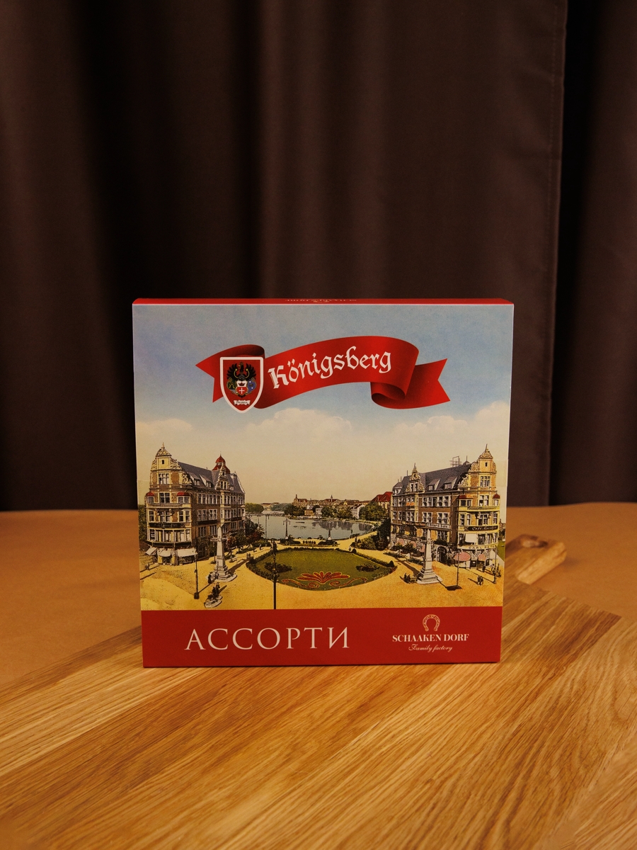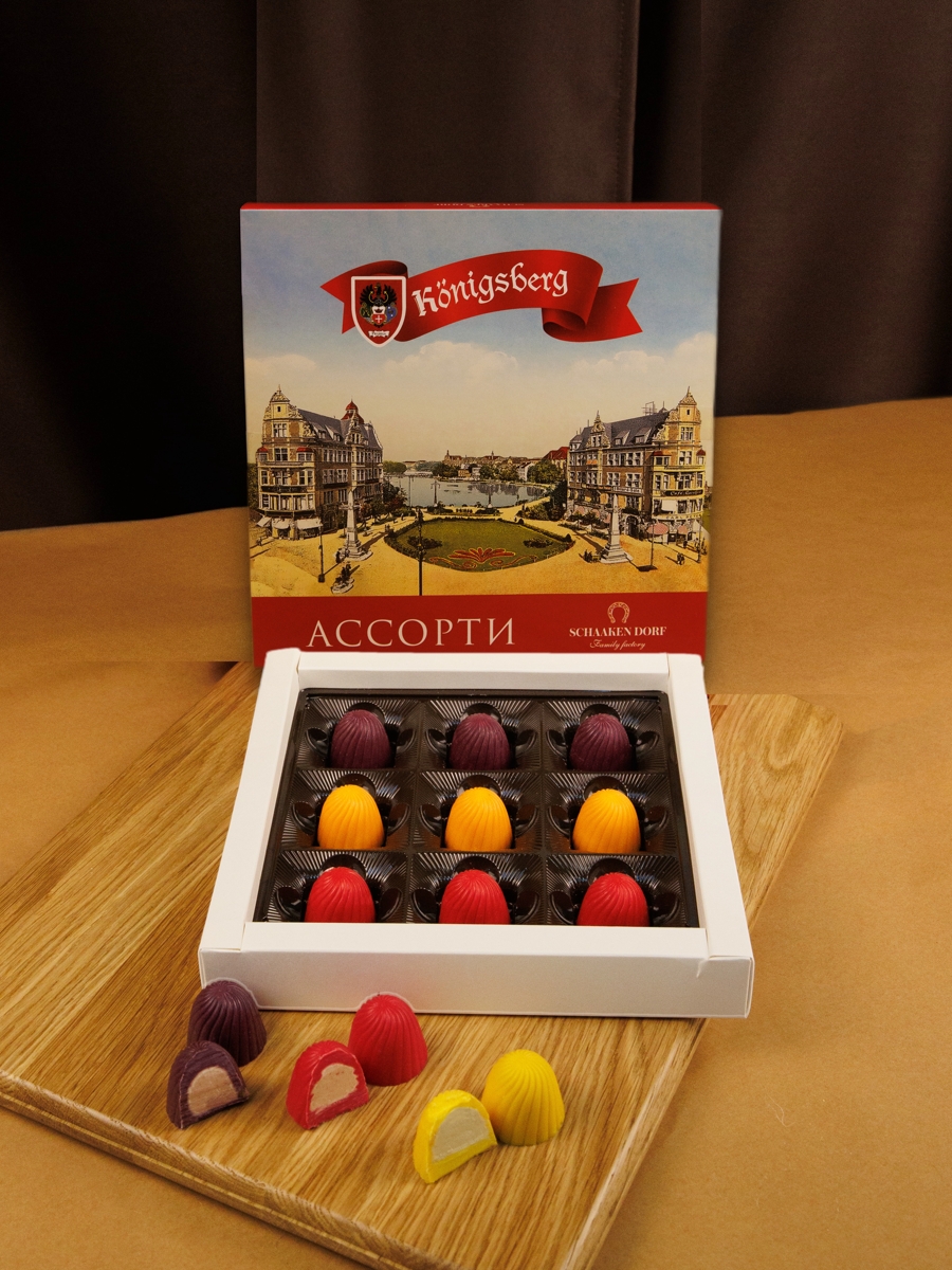 Ассорти из 3 видов конфет с натуральными сублимированными ягодами - пралине со вкусом малины, манго и черники в ягодной глазури. В подарочной коробке с видами Калининграда.
