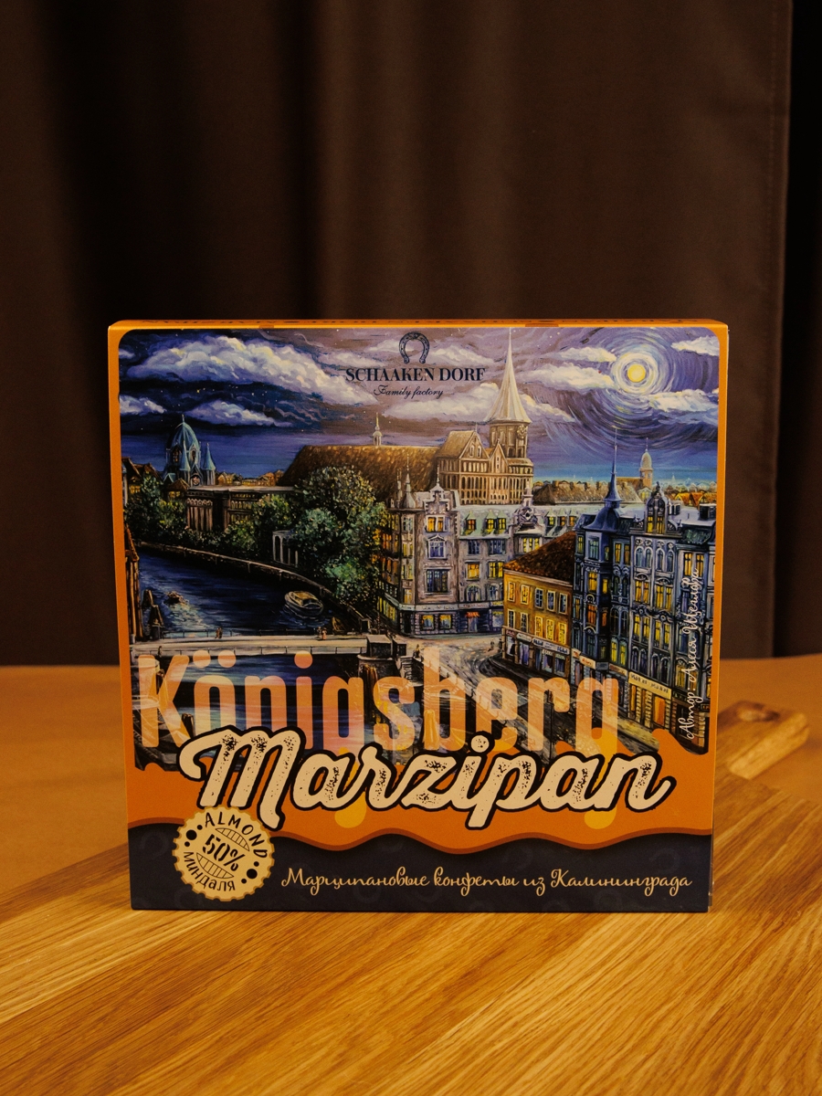 Ассорти из марципановых конфет (содержание миндаля 50%) в натуральном шоколаде. Подарочная коробка с видами Калининграда.