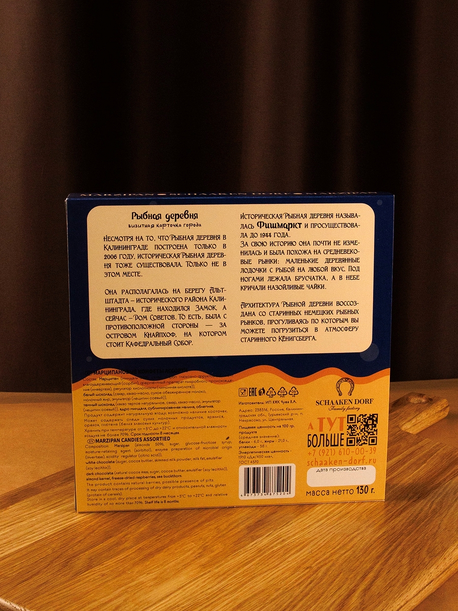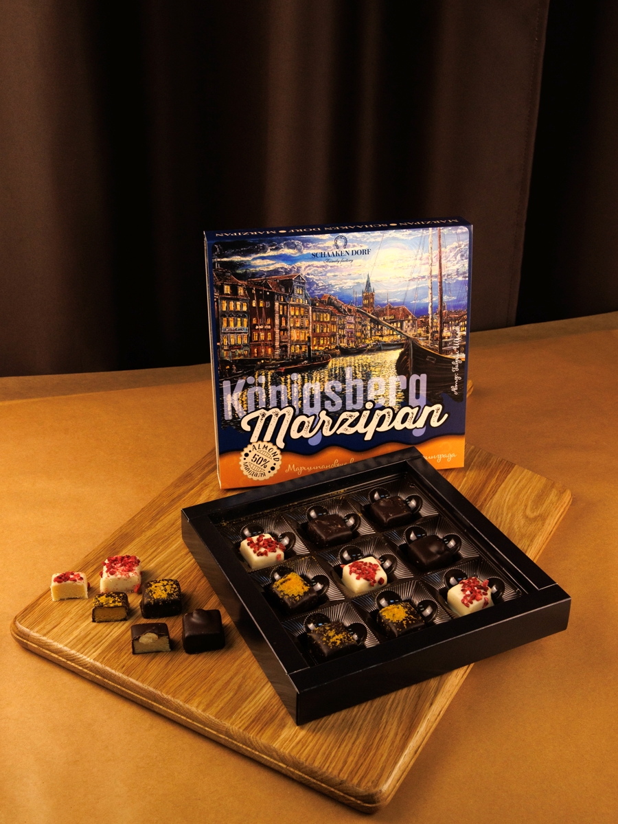 Ассорти из марципановых конфет (содержание миндаля 50%) в натуральном шоколаде. Подарочная коробка с видами Калининграда.