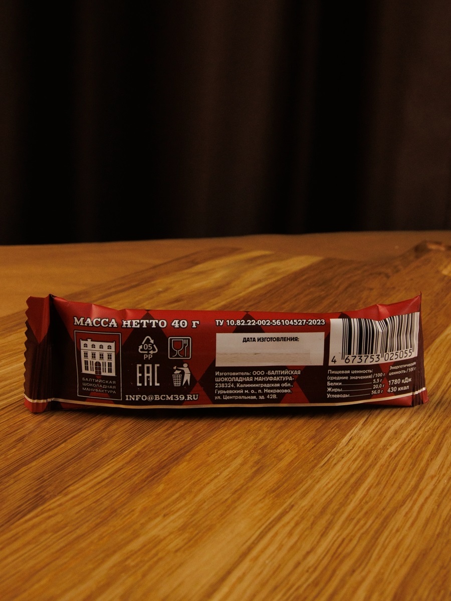 Состав: марципан (сахар, миндаль (33 %), сироп глюкозно-фруктозный, сорбит, инвертаза, регулятор кислотности); темный шоколад (какао тертое натуральное, сахар, какао-масло, эмульгатор: соевый лецитин, ароматизатор «Ваниль»); цукаты из вишни (вишня, сахар).