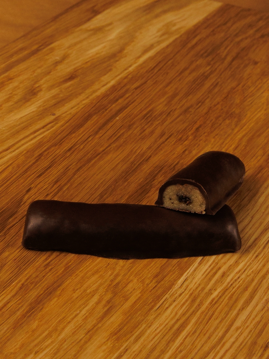 Марципановый батончик (33% миндаля) с маком в натуральном темном шоколаде.