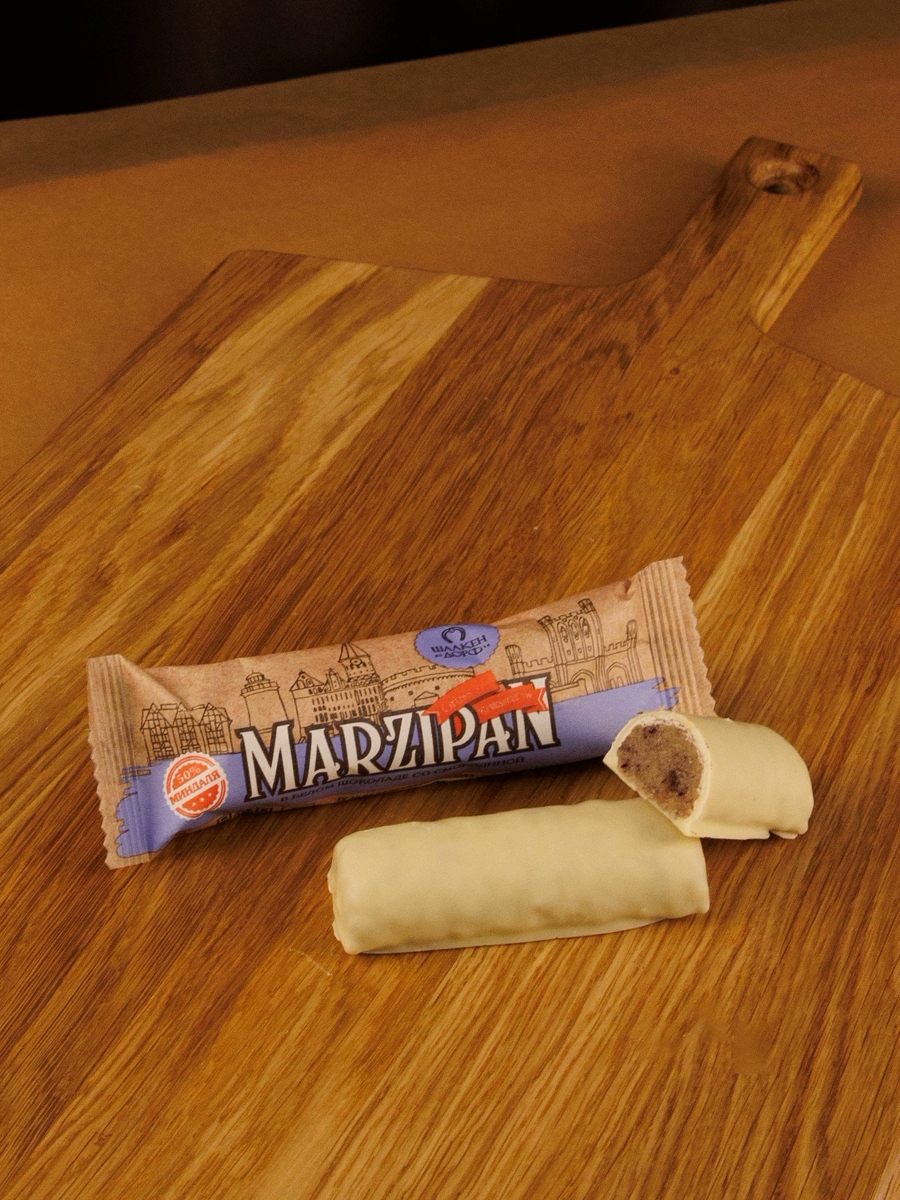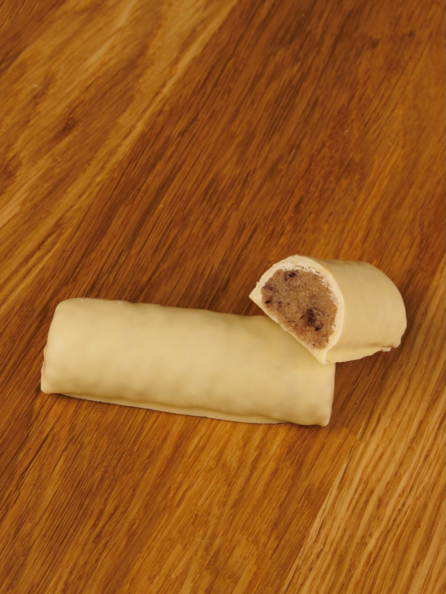 Марципановый батончик (50% миндаля) с сублимированной черной смородиной в натуральном белом шоколаде.