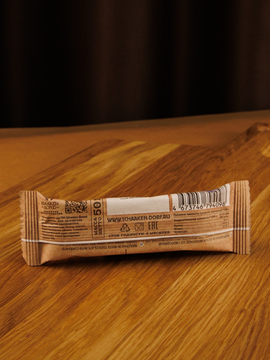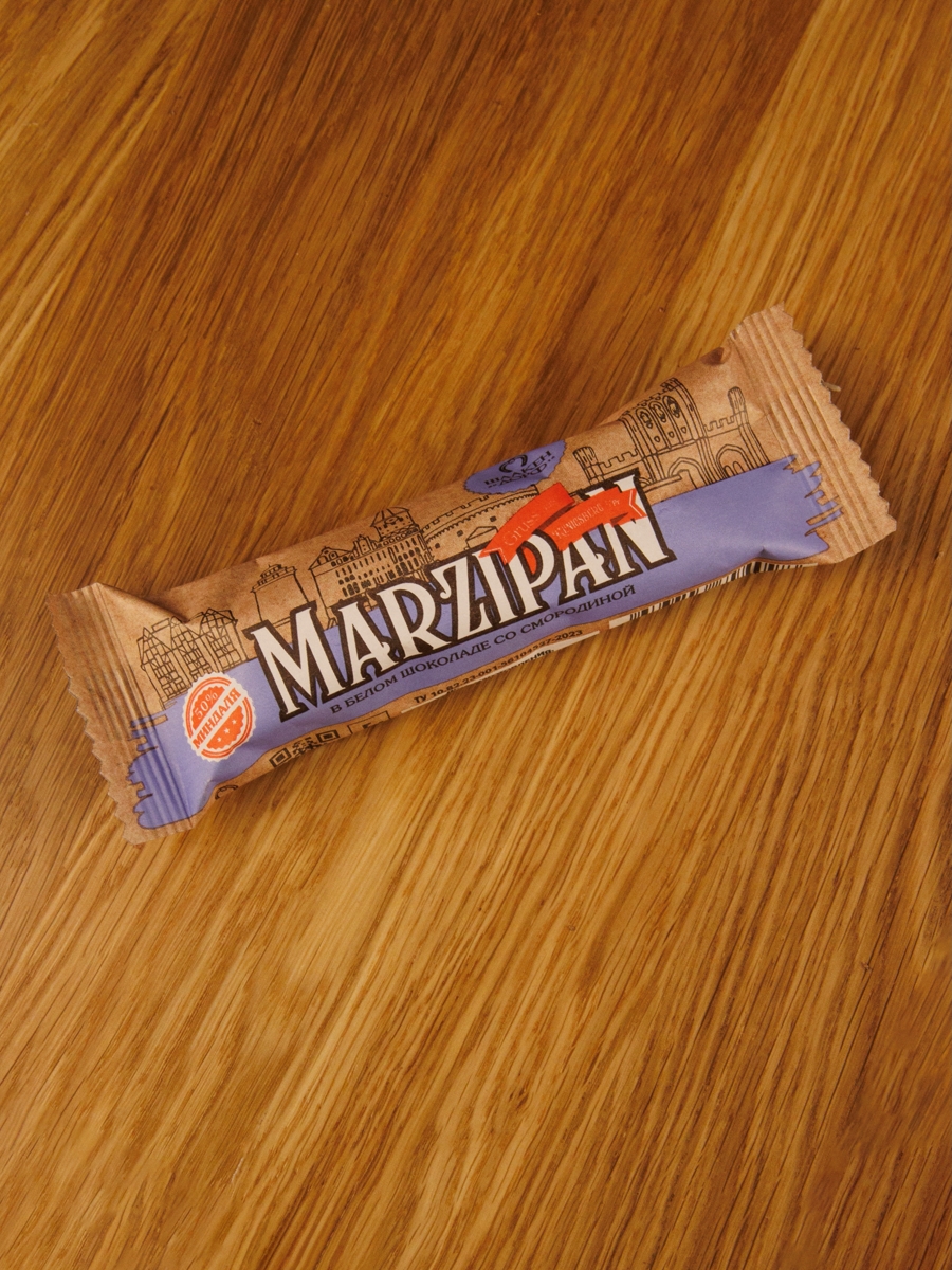 Состав: марципан (сахар, миндаль (50%), сироп глюкозно-фруктозный, агент влагоудерживающий – сорбит, ферментный препарат микробного происхождения – инвертаза, регулятор кислотности – лимонная кислота); белый шоколад (сахар, какао-масло, сухое обезжиренное молоко, сыворотка сухая молочная, молочный жир, эмульгатор – соевый лецитин, ароматизатор «Ваниль»); черная смородина сублимационной сушки. Может содержать следы переработки арахиса, глютена (белка злаковых культур). Возможно наличие косточек в ягодах смородины.