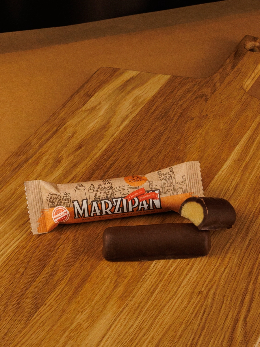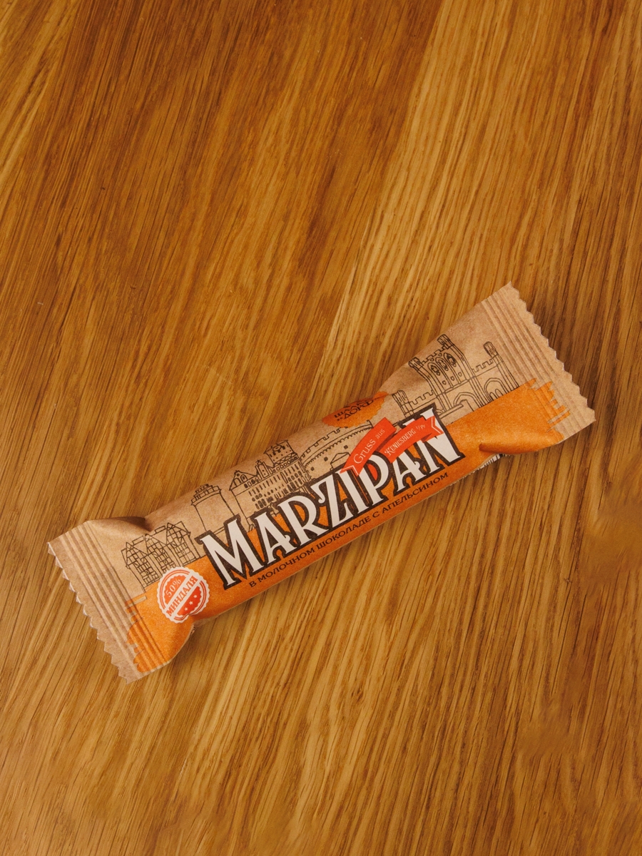 Марципановый батончик (50% миндаля) с сублимированным апельсином в натуральном молочном шоколаде.