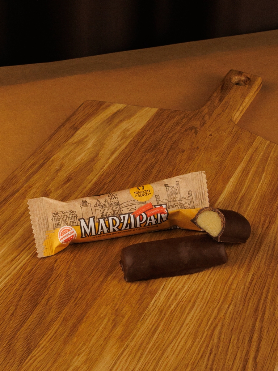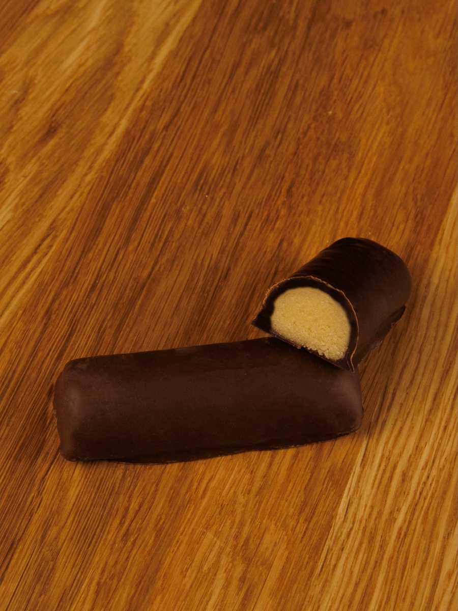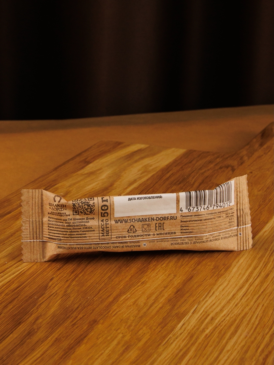 Марципановый батончик (50% миндаля) с сублимированной облепихой в натуральном темном шоколаде.