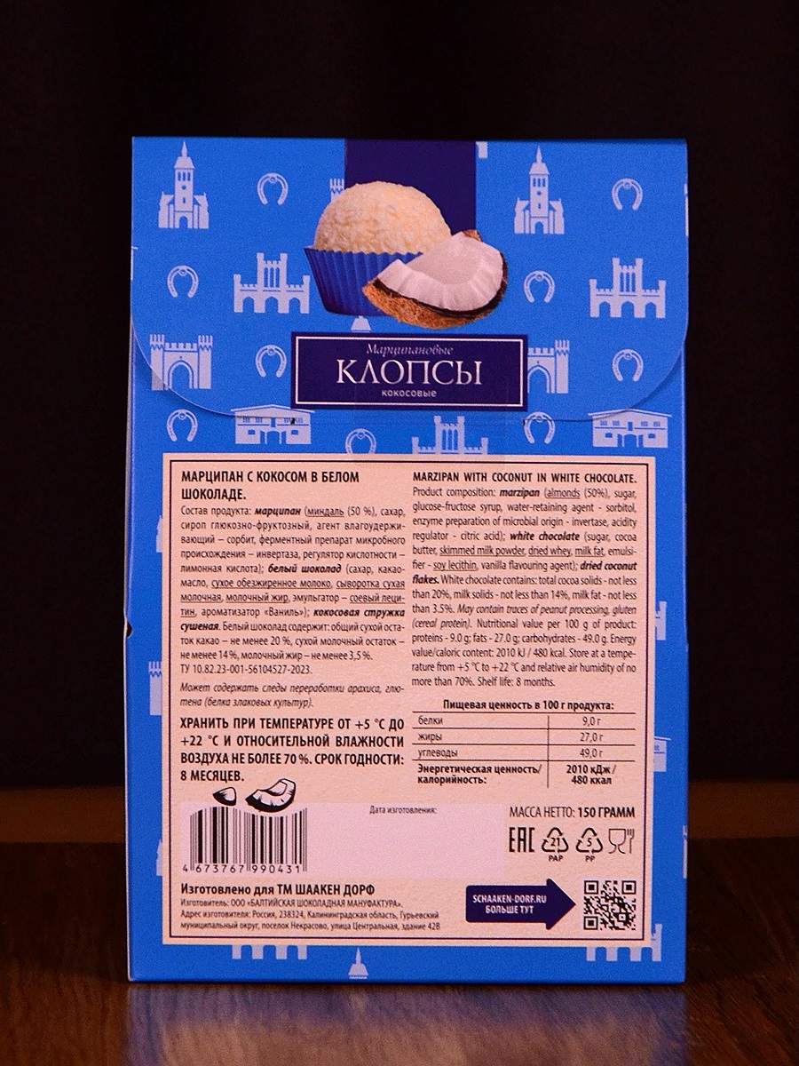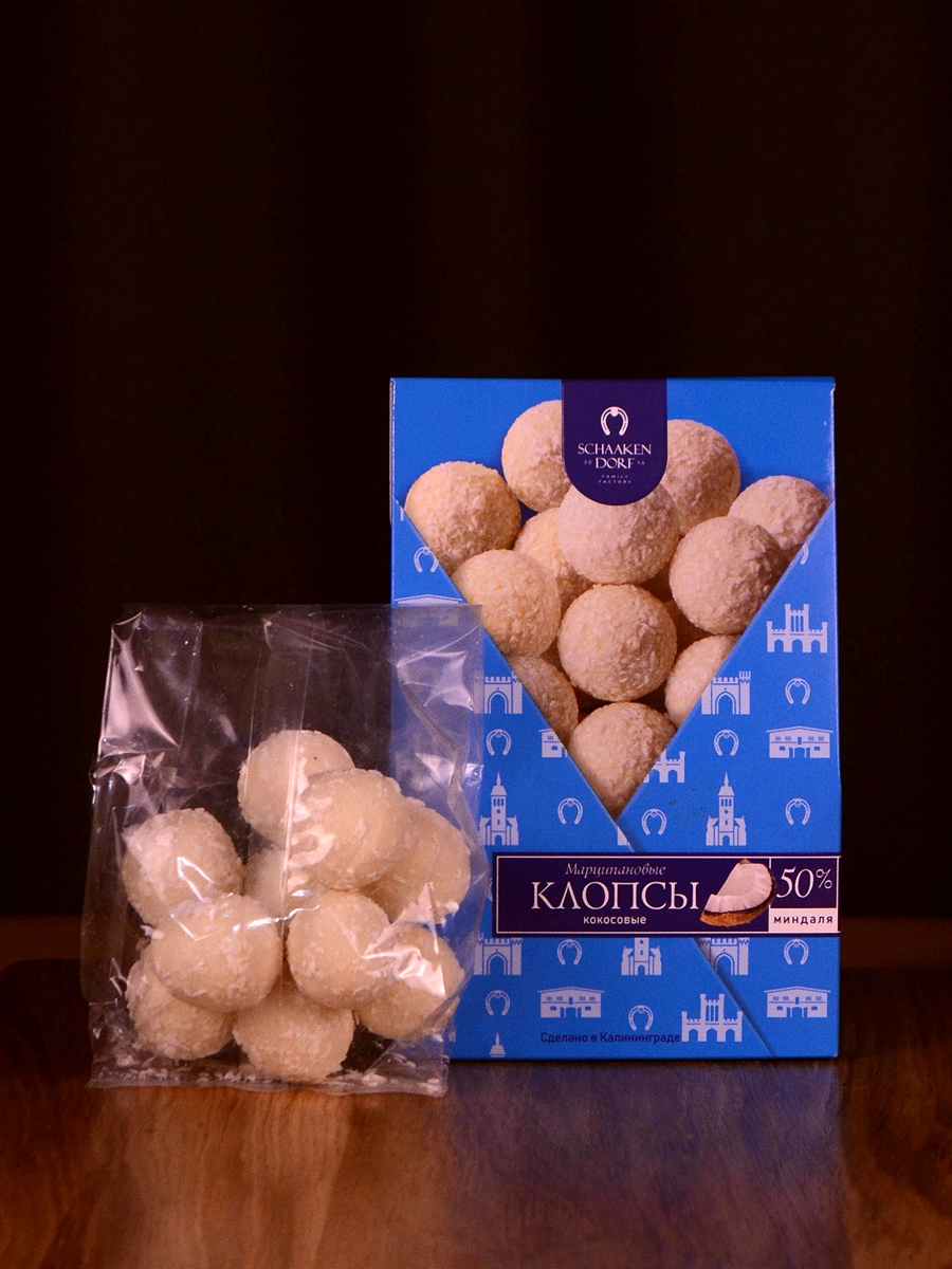 Традиционные калининградские клопсы из марципана (50% миндаля) в обсыпке из кокосовой стружки.