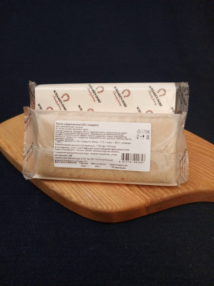 Марципановая масса без сахара с содержанием миндаля 52%. Масса нетто - 200 грамм.