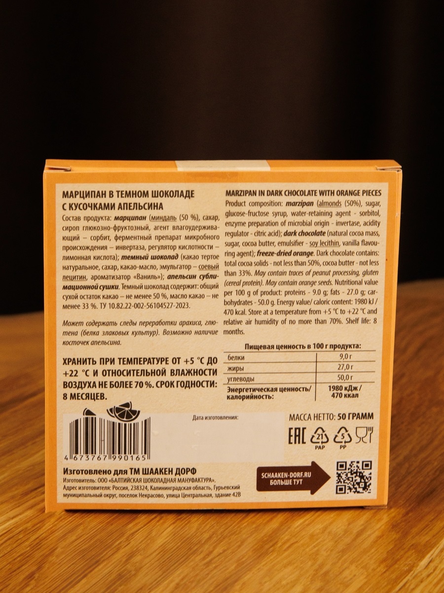Состав: марципан (сахар, миндаль (50%), сироп глюкозно-фруктозный, сорбит, инвертаза, регулятор кислотности – лимонная кислота); темный шоколад (какао тертое натуральное, сахар, какао-масло, эмульгатор – соевый лецитин, ароматизатор «Ваниль»; апельсин сублимационной сушки. Может содержать следы переработки молочных продуктов, арахиса, глютена (белка злаковых культур). Возможно наличие косточек апельсина.