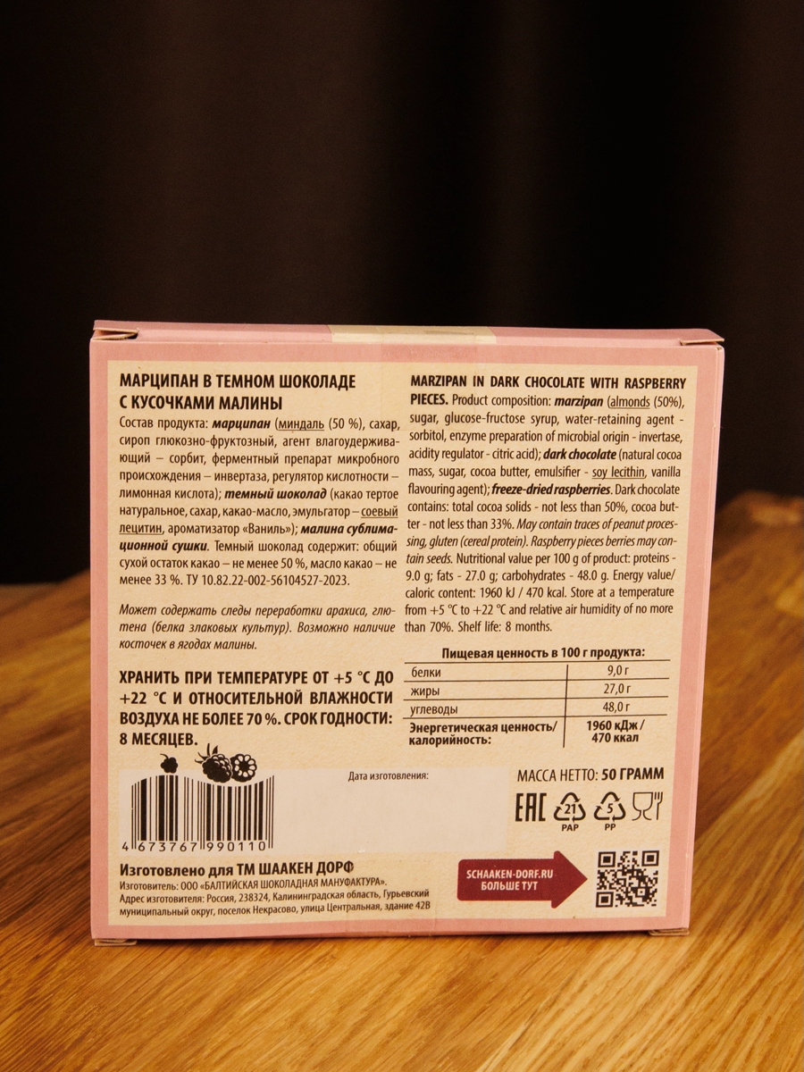 Состав: марципан (сахар, миндаль (50 %), сироп глюкозно-фруктозный, сорбит, ферментный препарат микробного происхождения; темный шоколад (какао тертое натуральное, сахар, какао-масло, эмульгатор – соевый лецитин, ароматизатор «Ваниль»; малина сублимационной сушки. Может содержать следы переработки молочных продуктов, арахиса, глютена (белка злаковых культур). Возможно наличие косточек в ягодах малины.
