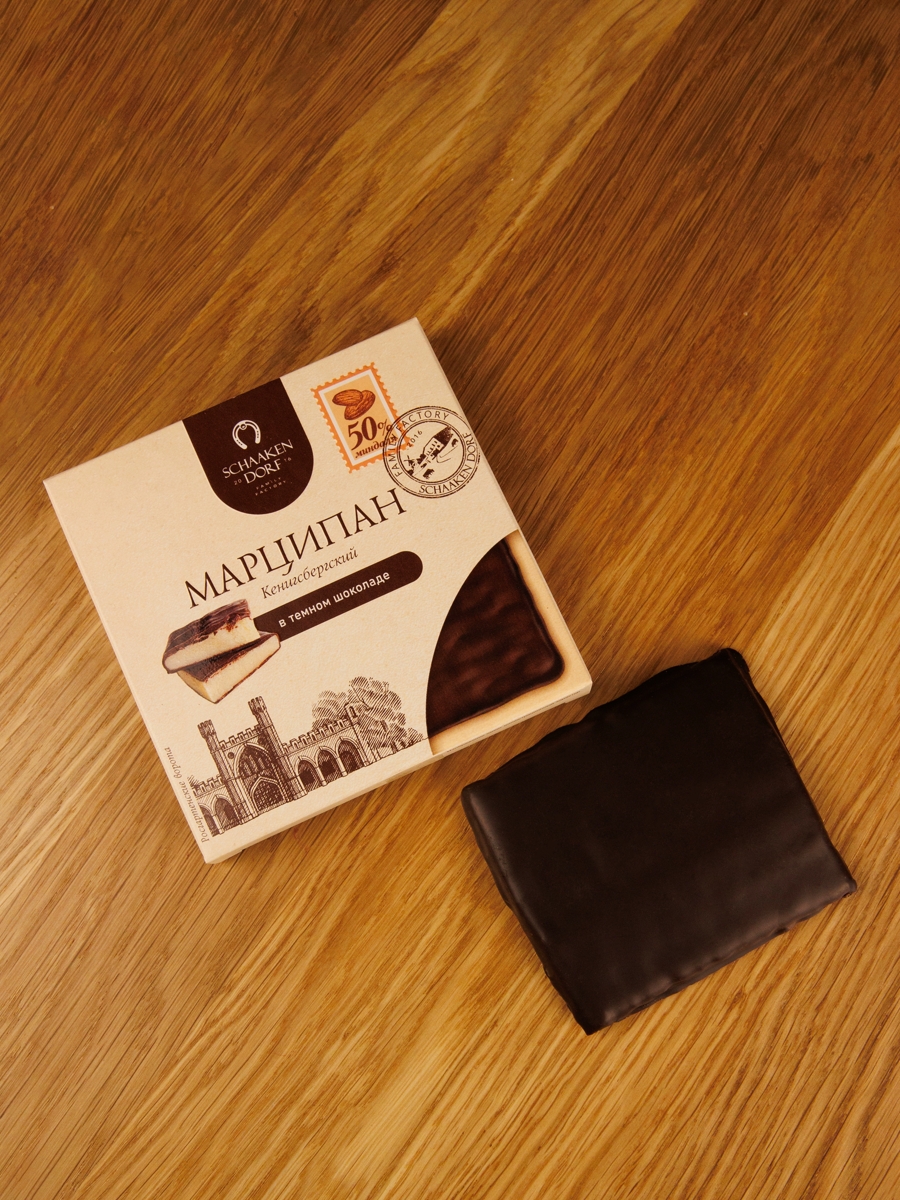 Марципановая плитка (50% миндаля) в натуральном темном шоколаде.