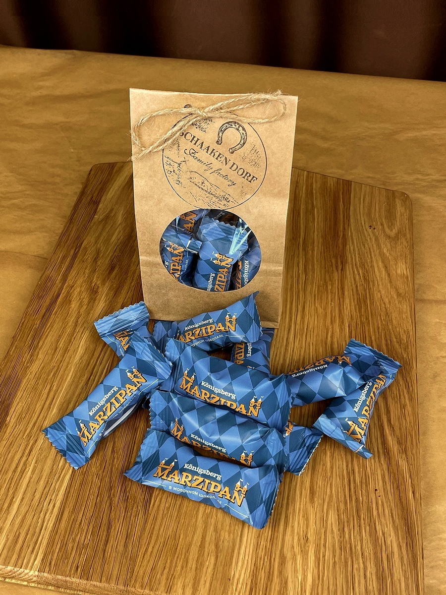 Марципановые конфеты в натуральном молочном шоколаде. Крафт-пакет с прозрачным окошком.