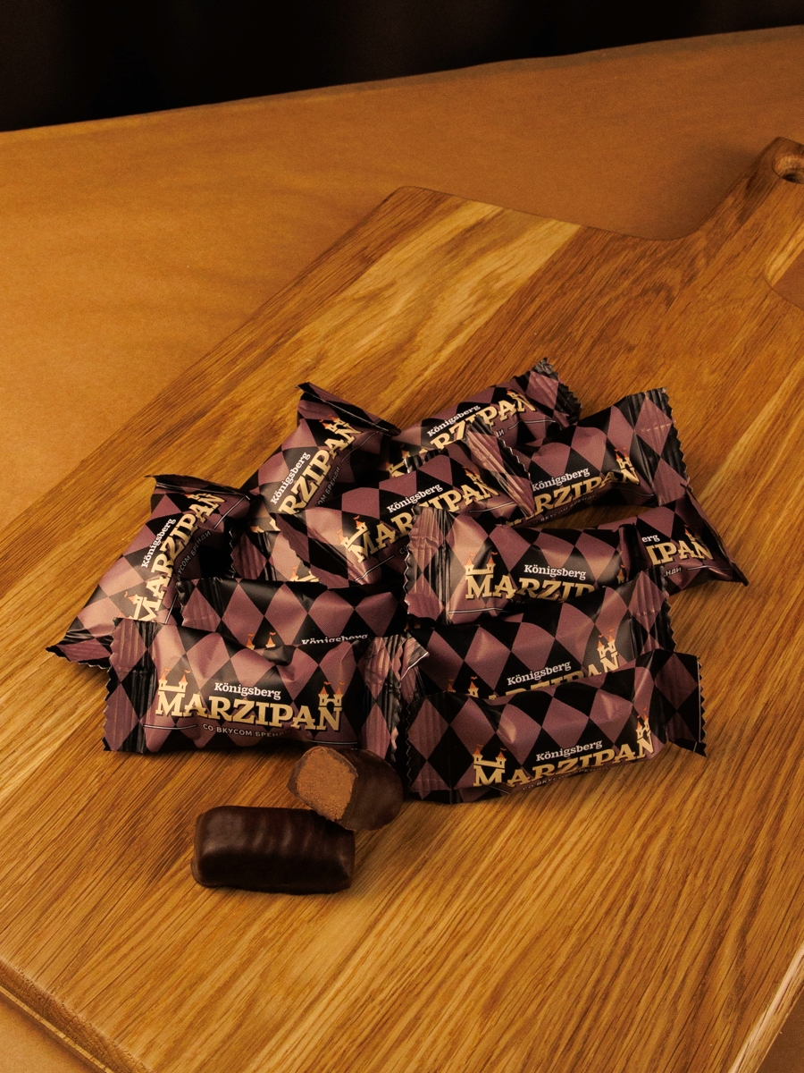 Марципановые конфеты со вкусом бренди в натуральном темном шоколаде. Крафт-пакет с прозрачным окошком.