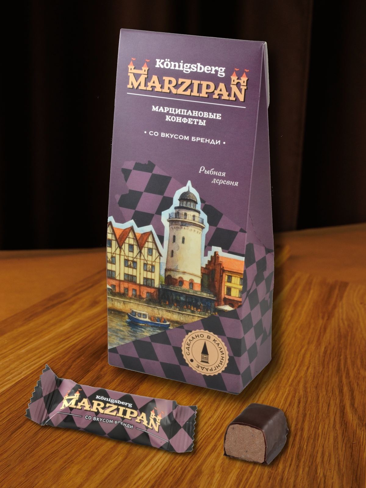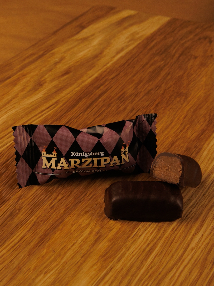 Марципановые конфеты со вкусом бренди в натуральном темном шоколаде.