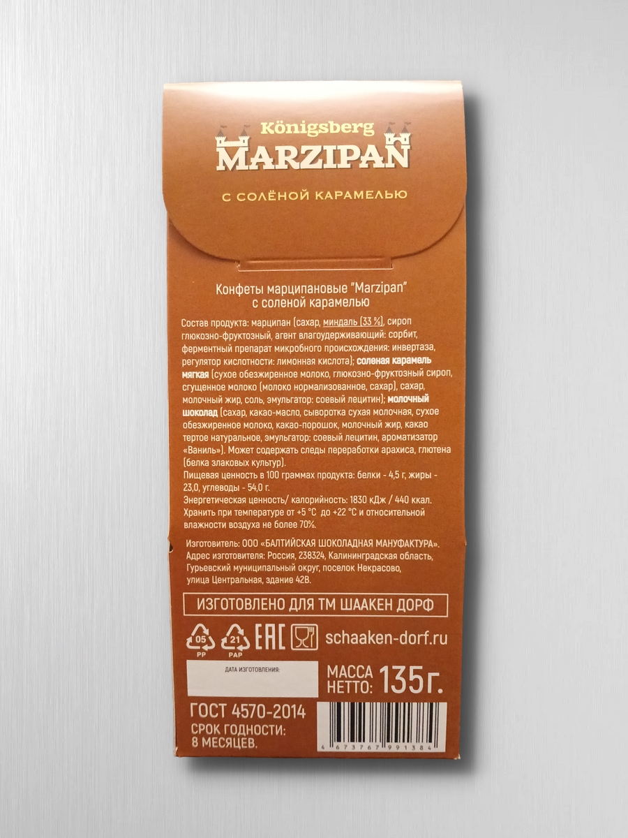 Состав: марципан (сахар, миндаль (33%), сироп глюкозно-фруктозный, агент влагоудерживающий: сорбит, ферментный препарат микробного происхождения: инвертаза, регулятор кислотности: лимонная кислота), ароматизатор "Бренди"; темный шоколад (какао тертое натуральное, сахар, какао-масло, эмульгатор: соевый лецитин, ароматизатор "Ваниль".