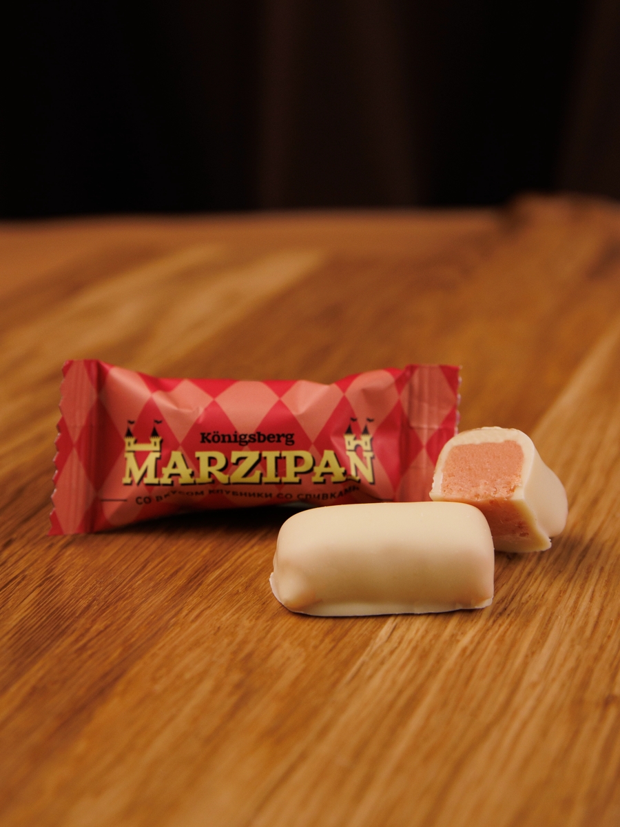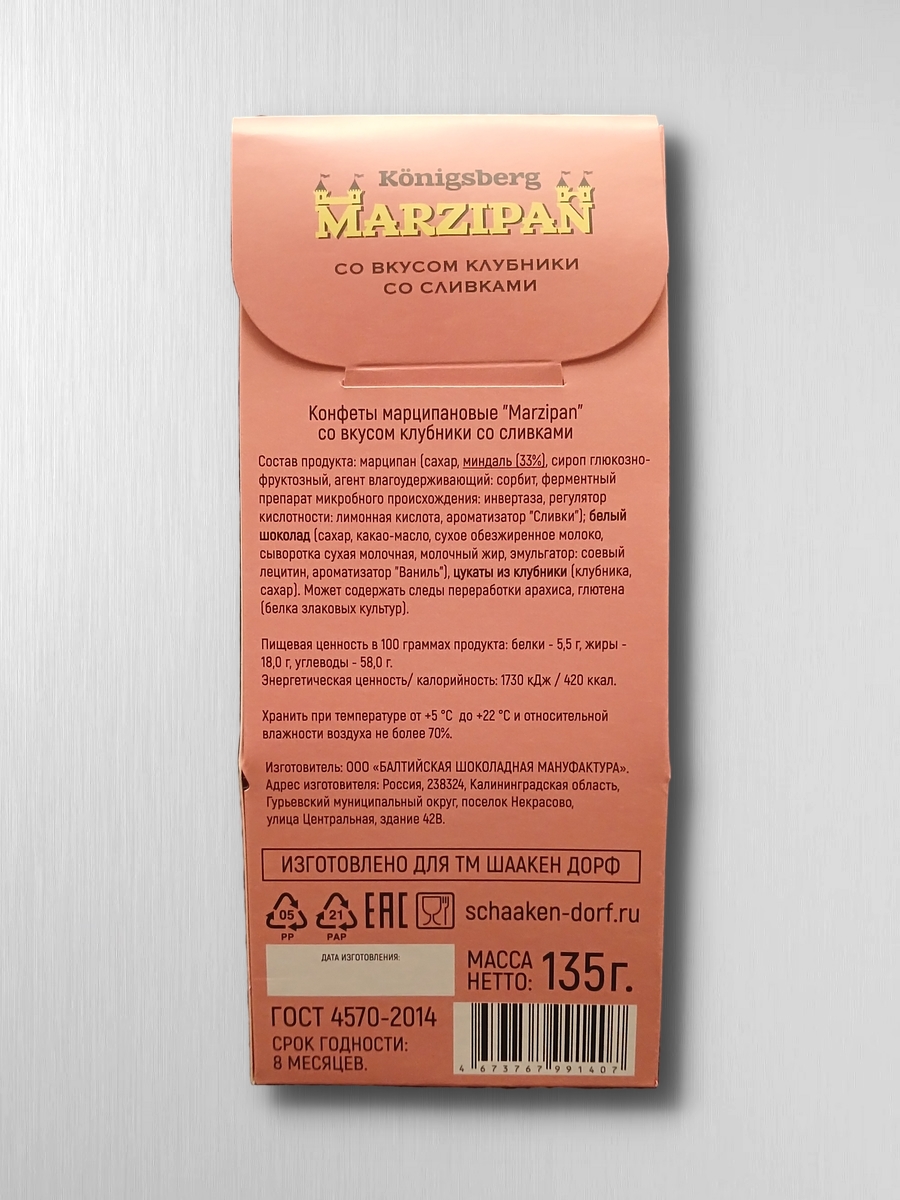 Состав: марципан (сахар, миндаль (33%), сироп глюкозно-фруктозный, агент влагоудерживающий: сорбит, ферментный препарат микробного происхождения: инвертаза, регулятор кислотности: лимонная кислота, ароматизатор "Сливки"); белый шоколад (сахар, какао-масло, сухое обезжиренное молоко, сыворотка сухая молочная, молочный жир, эмульгатор: соевый лецитин, ароматизатор "Ваниль"), цукаты из клубники (клубника, сахар).
