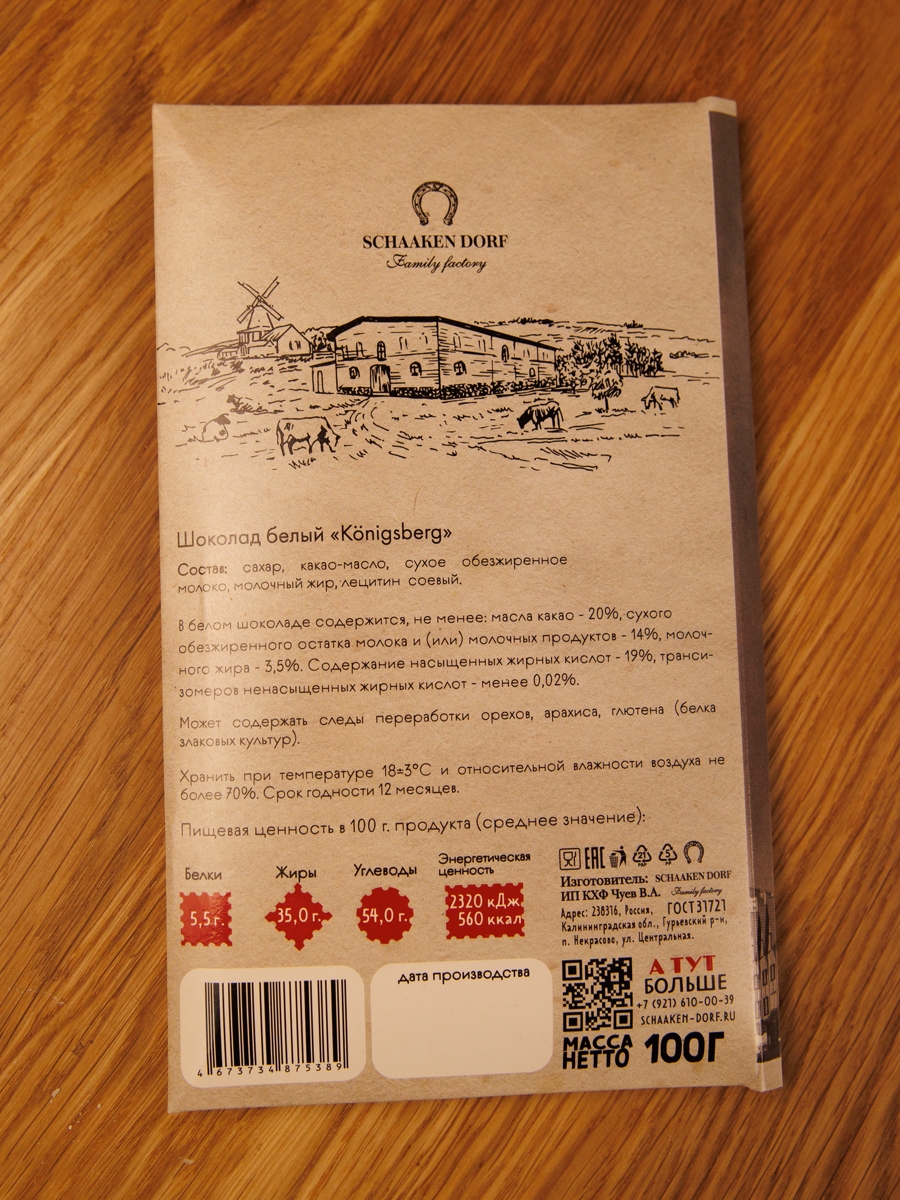 Белый шоколад (30% какао-масла). Упаковка в виде открытки с изображением достопримечательностей Кёнигсберга.