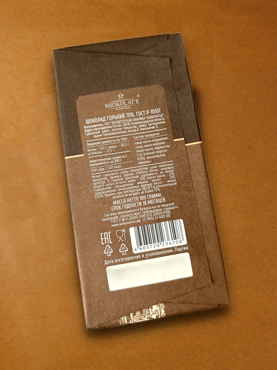 Горький шоколад (70% какао). Обертка с изображением Рыбной деревни в Калининграде.