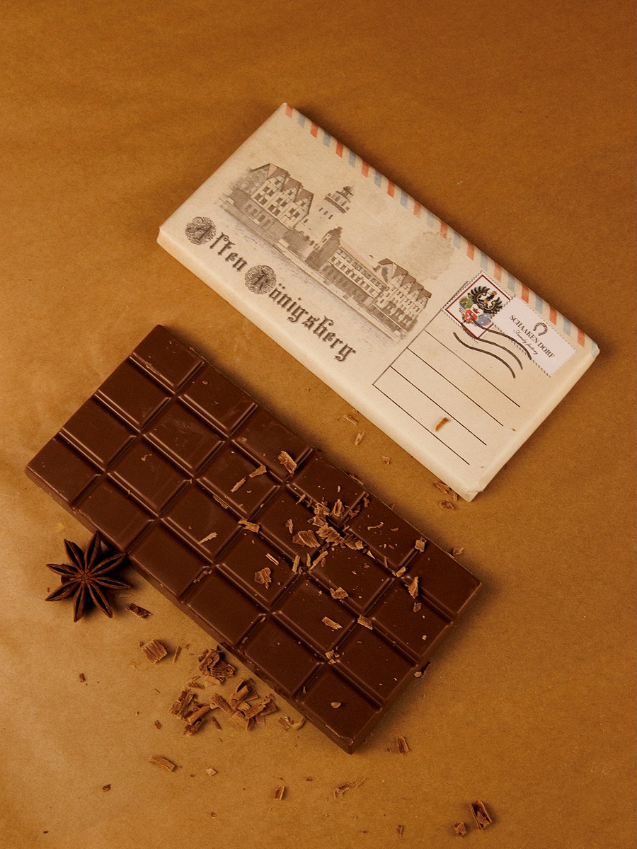 Молочный шоколад (35% какао). Обертка с изображением Рыбной деревни в Калининграде.