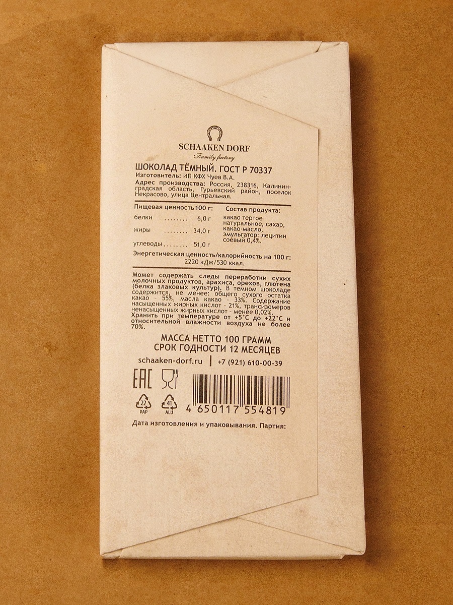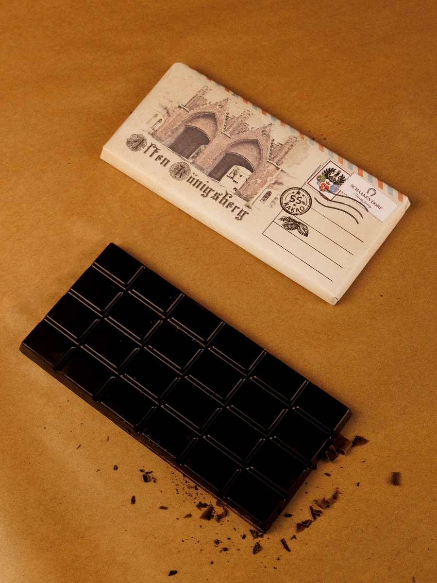 Темный шоколад (55% какао). Обертка с изображением Бранденбургских ворот в Калининграде.